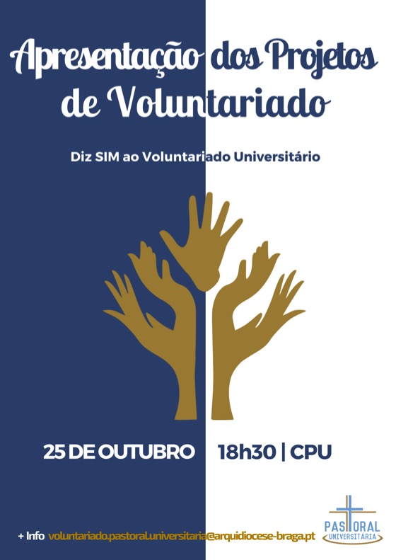 A Pastoral Universitária apresenta os projectos de voluntariado para o novo ano lectivo, no Centro Pastoral Universitário. A sessão está marcada para o dia 25 de Outubro, às 18h30.