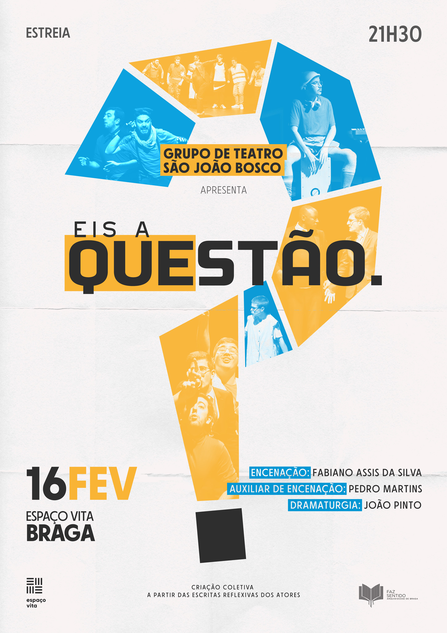 No próximo dia 16 de fevereiro, no Espaço Vita, o Grupo de Teatro S. João Bosco, grupo de teatro amador dos Seminários Arquidiocesanos de Braga, levará a palco a peça “Eis a questão”. O espetáculo tem início pelas 21h30.