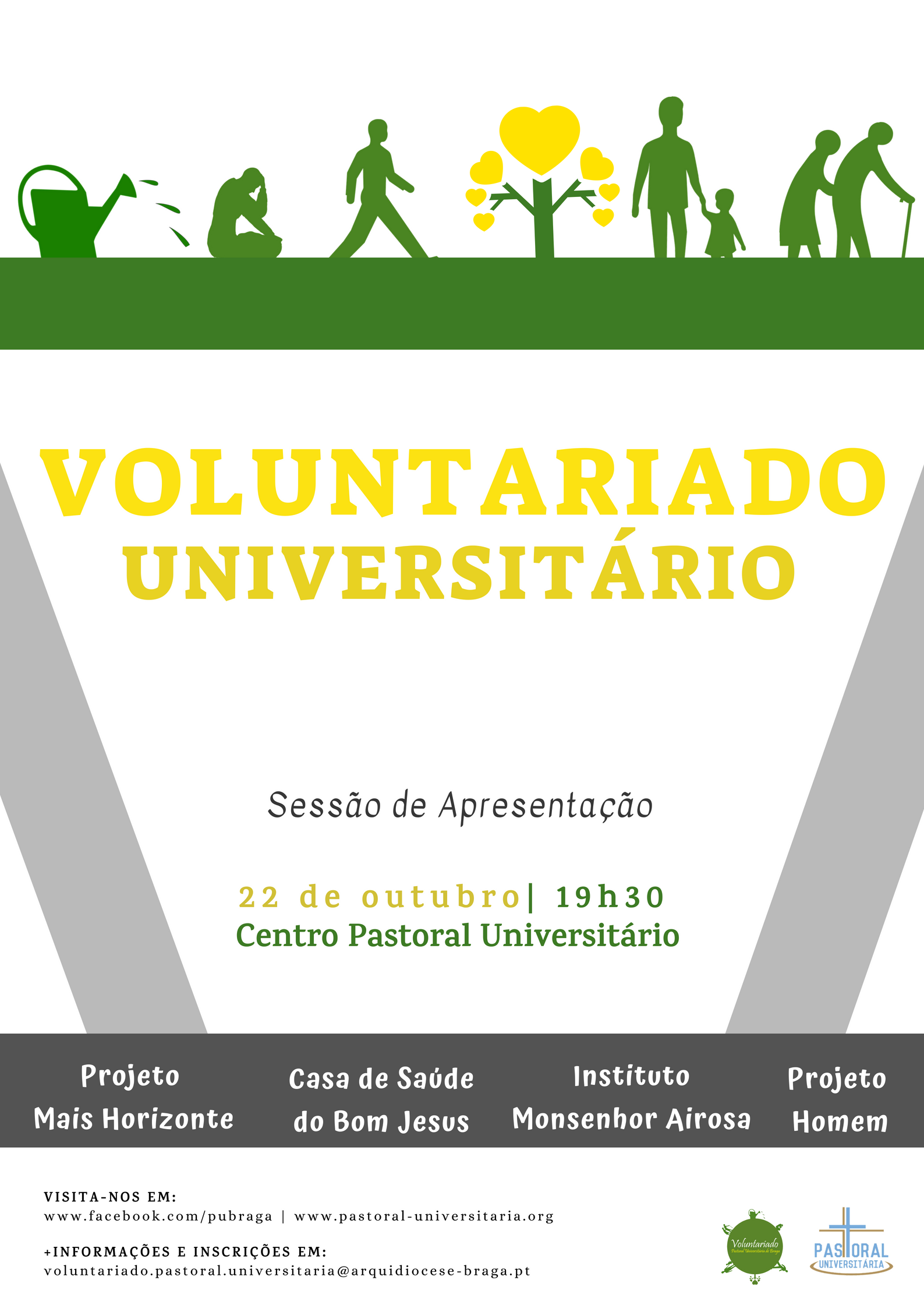 No dia 22 de Outubro, às 19h30, a Pastoral Universitária de Braga (PUB) apresenta os seus projectos de voluntariado para este ano no Centro Pastoral Universitário. Os interessados podem efectuar a sua inscrição em www.pastoral-universitaria.org.