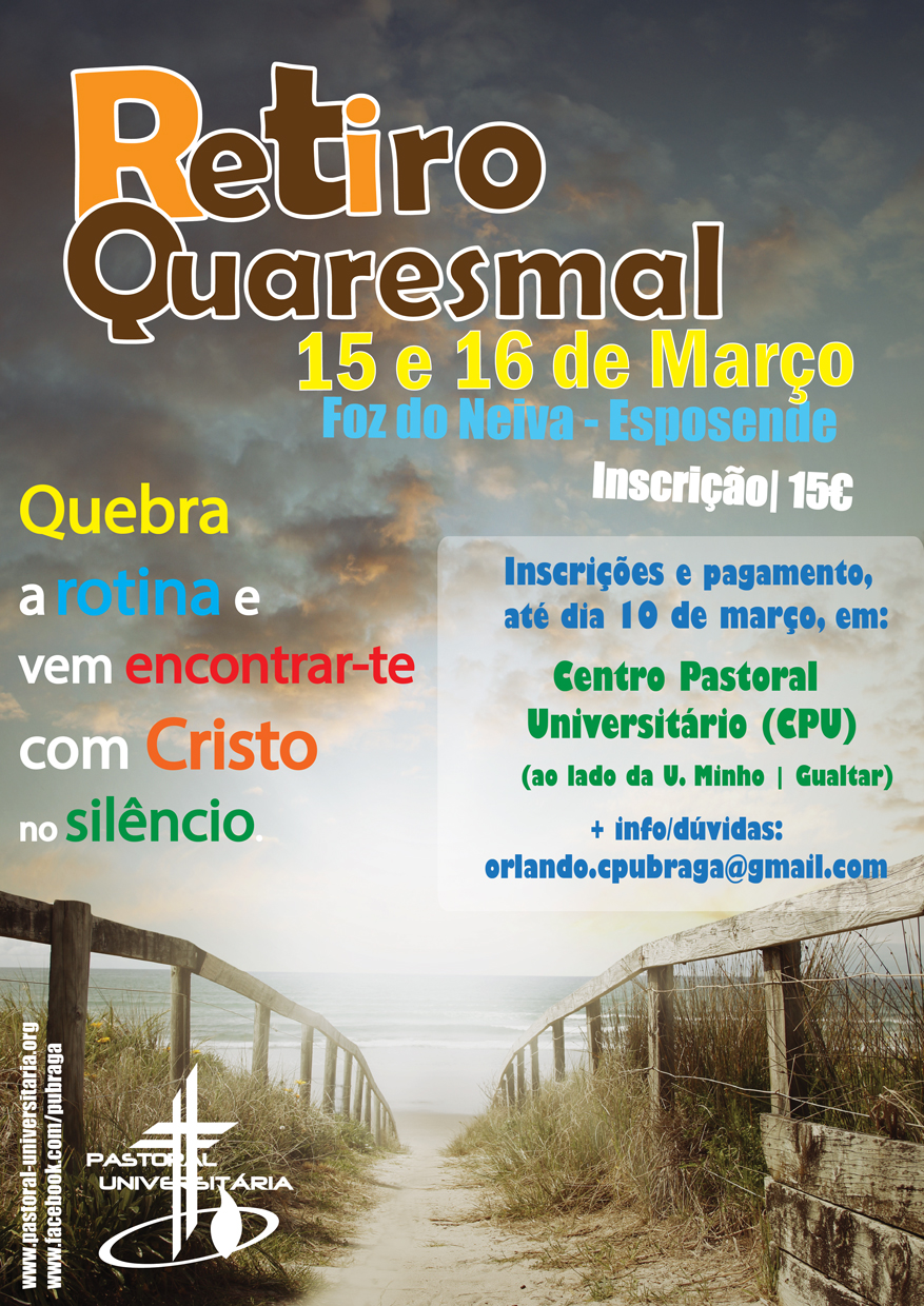 A Pastoral Universitária da Arquidiocese organizará nos dias 15 e 16 de Março um Retiro Quaresmal. A proposta são dois dias de silêncio, num diálogo simples e fraterno com o Outro e com Deus, numa vontade de quebrar a rotina na ânsia de novos sentidos, A