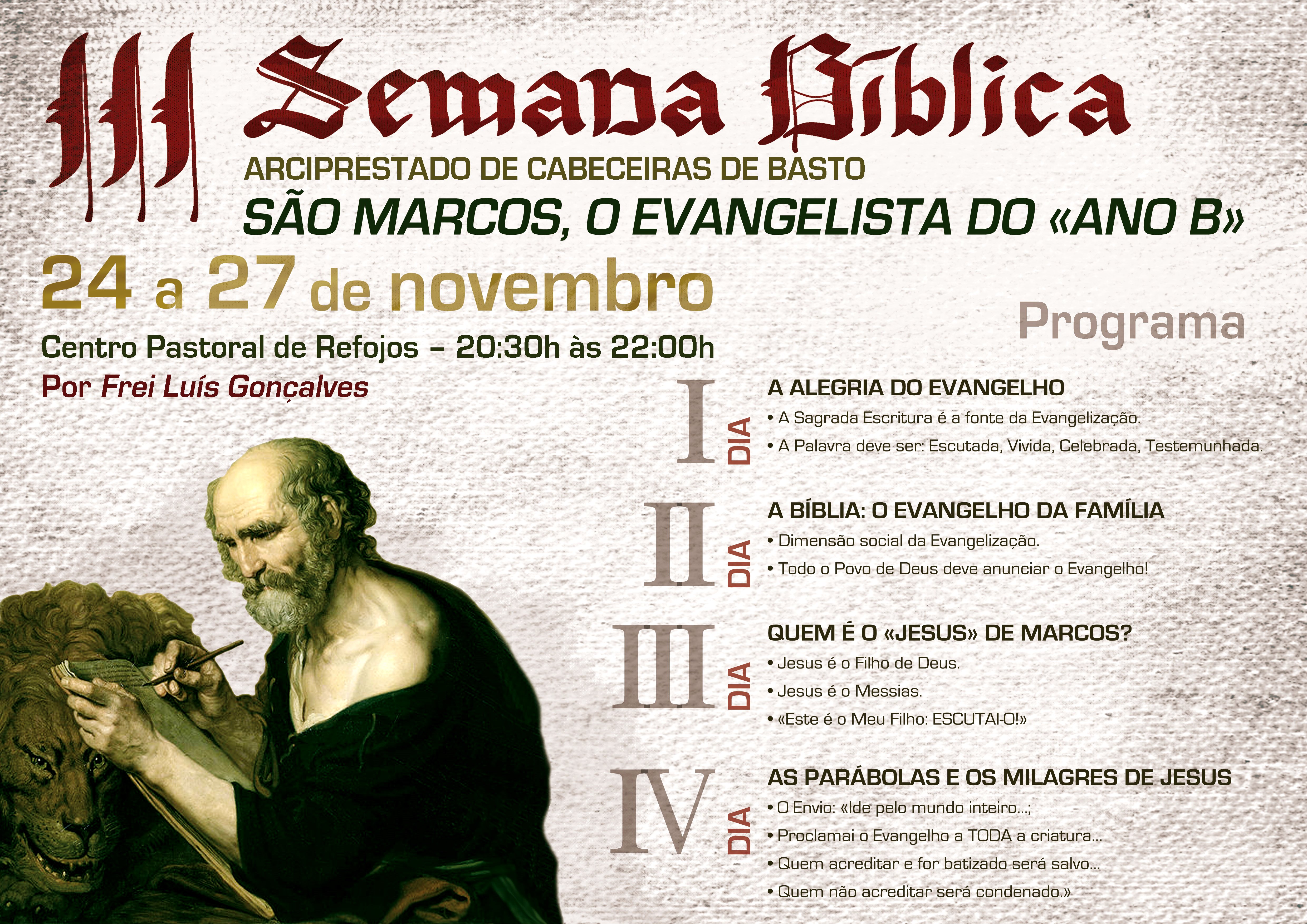 A “III Semana Bíblica Arciprestal" será orientada por Frei Luís Gonçalves, que abordará o tema “São Marcos, o Evangelista do Ano B” ao longo de quatro dias e tendo em conta várias áreas.