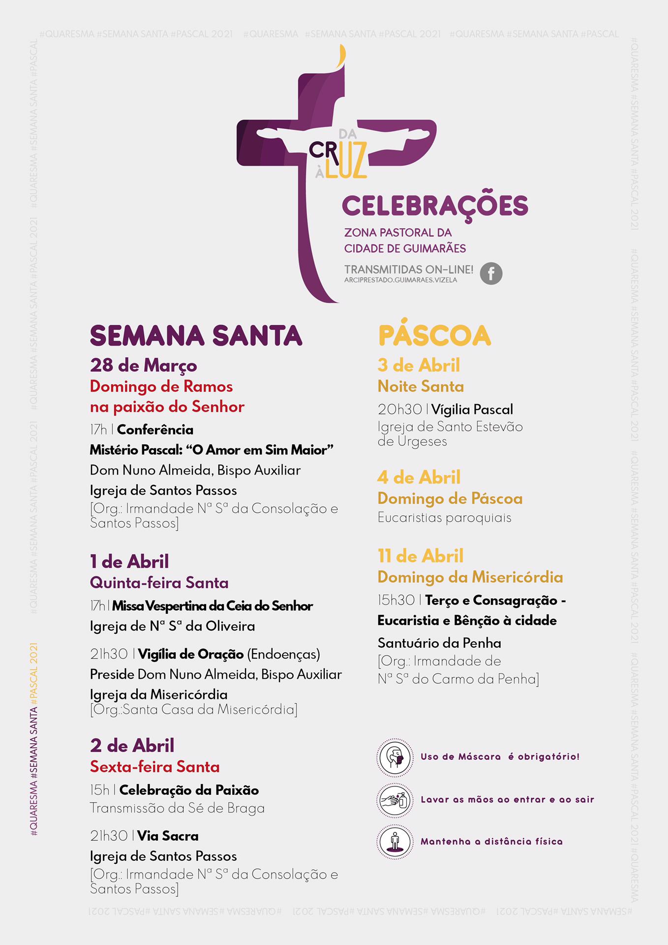 A Zona Pastoral da cidade de Guimarães, juntamente com as Irmandades de Nossa Senhora da Consolação e Santos Passos, de Nossa Senhora do Carmo da Penha e a Santa Casa da Misericórdia de Guimarães organizaram-se para fazer chegar a todos quantos estão ainda confinados pelas circunstâncias da pandemia ou impossibilitados de estarem nas suas igrejas nesta ocasião, celebrações, cerimónias e eventos próprios destes tempos litúrgicos, desde o Domingo de Ramos ao Domingo da Divina Misericórdia.