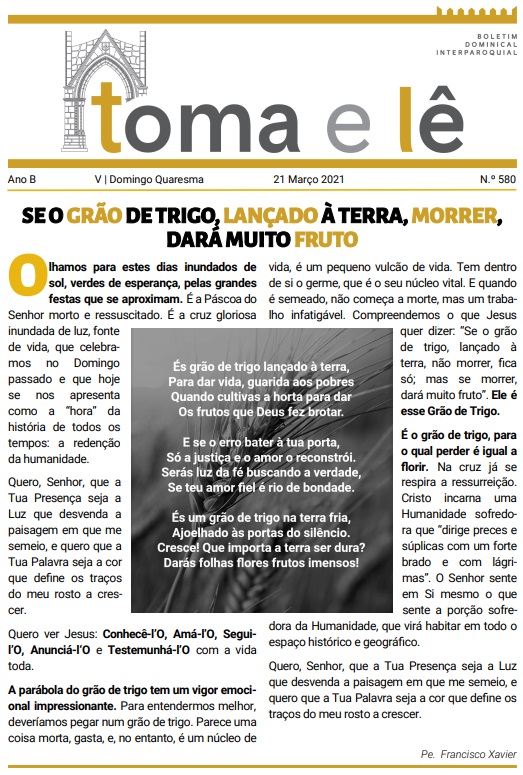 A edição deste Boletim Dominical, de dezasseis paróquias de Guimarães (incluindo oito capelanias), correspondente ao V Domingo da Quaresma, pode ser lida na seguinte ligação