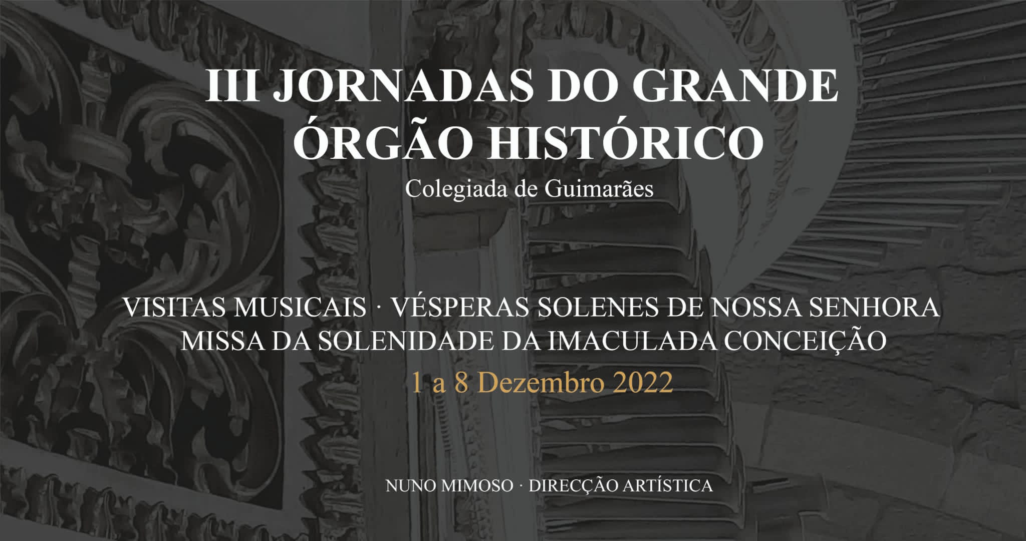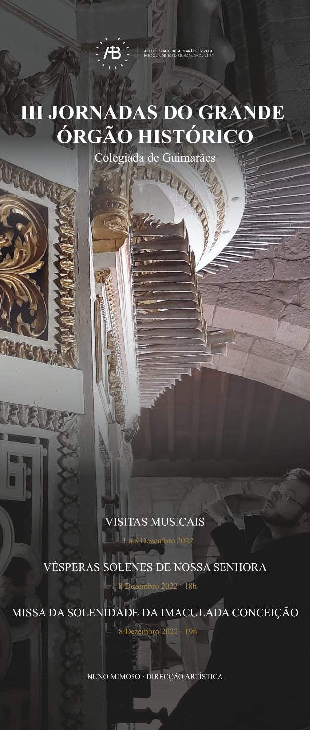 As Jornadas do Grande Órgão Histórico 2022 comemoram o 9º Aniversário do restauro deste órgão monumental, na efeméride litúrgica da Solenidade da Conceição Imaculada de Nossa Senhora. A III edição deste Festival prossegue a parceria entre a Paróquia da Oliveira e o Museu de Alberto Sampaio, contando com um patrocínio do Município de Guimarães. É diretor artístico Nuno Mimoso, organista, maestro e musicólogo, diplomado pela Escola Superior de Música Sacra de Ratisbona na Alemanha. O templo quatrocentista estará engalanado para acolher visitas e liturgias solenes e louvar a sua Padroeira.