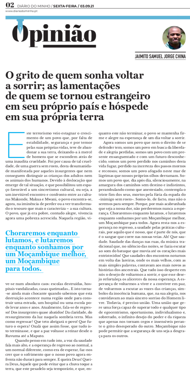 Agora somos um povo que nem o direito de se defender tem; somos um povo em busca da liberdade e alegria perdidas; somos um povo com um presente ensanguentado e com um futuro desconhecido; somos um povo perdido nos caminhos desta vida fugaz; perdido na incerteza dos passos mornos e receosos; somos um povo afogado neste mar de lágrimas que nossos próprios olhos derramam. Somos um povo que, dia após dia, silenciosamente, na amargura dos caminhos sem destino e indistintos, perambulando como que anestesiado, contempla o triste fim dos seus, mortos pela fúria da espada do «inimigo sem rosto». Somo-lo, de facto, mas não o seremos para sempre. Porque, por mais acabrunhada que seja a nossa dor, não perderemos nunca a esperança. Choraremos enquanto lutamos, e lutaremos enquanto sonhamos por um Moçambique melhor, um Moçambique para todos. Agora resta-nos a esperança no regresso, a saudade pelas práticas culturais, por aquilo que é nosso, que é parte de nós, que é o sangue que corre nas nossas veias. Ah! Que saudade. Saudade das danças nas ruas, da música tradicional que, no silêncio das noites, se fazia escutar ao som do batuque que movia até os corações mais entristecidos! Que saudades dos encontros noturnos em volta das lareiras, onde os mais velhos, com as mais simples palavras, contavam aos mais novos as histórias dos ancestrais. Que tudo isso desperte em nós o desejo de voltarmos a sorrir, e que esse desejo refortaleça os alicerces da nossa esperança. A esperança de voltarmos a viver e a conviver em paz, de voltarmos a escutar as vozes das crianças, símbolos da inocência humana, que, na sua alegria, nos convidavam ao mais sincero sorriso do Homem livre. Todavia, é preciso união. Uma união que gere uma força capaz de superar todo e qualquer tipo de egocentrismo, oportunismo, individualismo e, sobretudo, o infinito desejo do poder e da riqueza que apenas nos tornam cegos e insensíveis perante o grito desesperado do outro. Moçambique não pode permitir que a segurança de uns seja a desgraça para os outros.