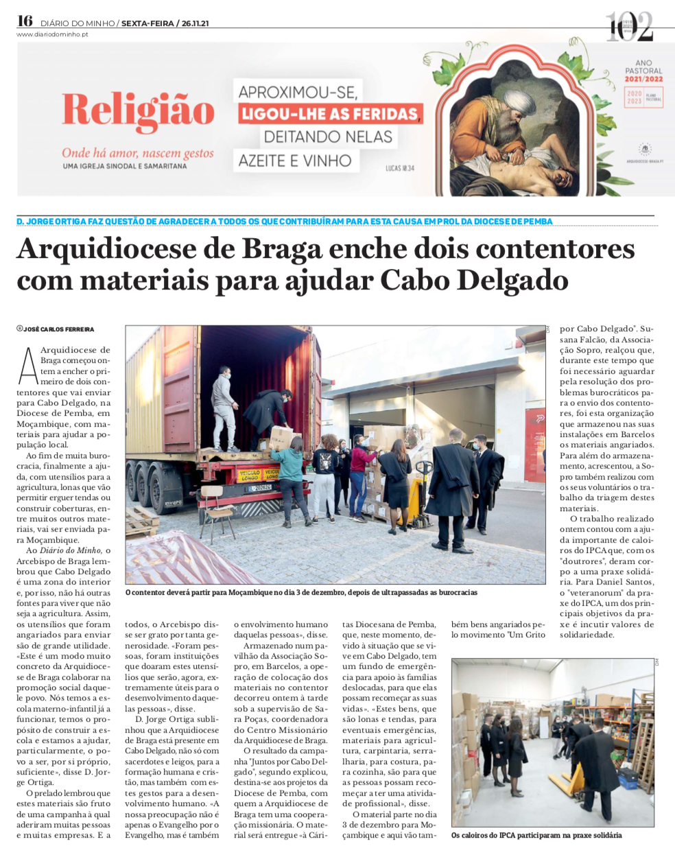 Carregamos, finalmente, na passada quinta e sexta-feira, dias 25 e 26 de novembro, os dois contentores para Cabo Delgado, com os bens doados recolhidos pela Arquidiocese de Braga e pelo movimento civil “Um grito por Cabo Delgado”, entre janeiro e março de 2021. Estes sairão do dia 3 de dezembro do Porto de Leixões, rumo ao Porto de Nacala, em Moçambique, com data prevista de chegada a 27 de fevereiro 2022.