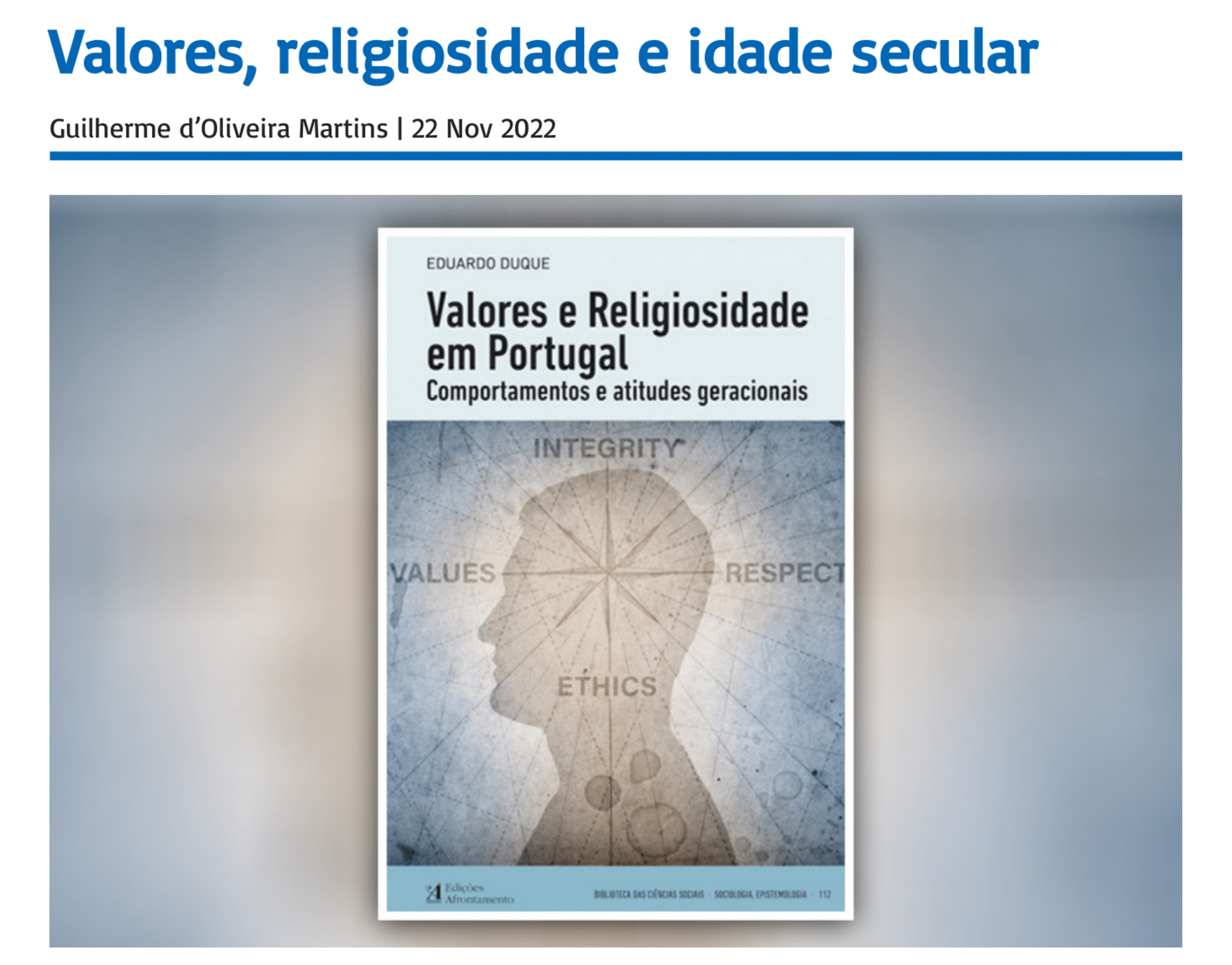 A publicação de Valores e Religiosidade em Portugal – Comportamentos e Atitudes Geracionais (Afrontamento, 2022) do cónego Eduardo Duque constitui oportunidade para refletirmos sobre a necessidade de compreender a importância dos valores éticos e religiosos na sociedade contemporânea. Importa recordar o que Hermann Broch (1886-1951) afirmou sobre o “vazio de valores”, que afeta a sociedade contemporânea e os seus efeitos na fragilização comunitária. Por outro lado, Charles Taylor (1931) na sua análise sobre a Era Secular (2007) distingue três formas de secularização: a religião como questão privada e a sua ausência nos espaços públicos, o abandono das convicções e práticas religiosas e a ocorrência redutora de um humanismo antropocêntrico. Esta tripla dimensão leva a uma alteração na afirmação do fenómeno religioso, interna e externamente – centrando-se Taylor numa perspetiva intrarreligiosa. Neste sentido, a intensidade da secularização está ligada ao modo como a religião se manifesta na sociedade, sendo um fenómeno complexo.