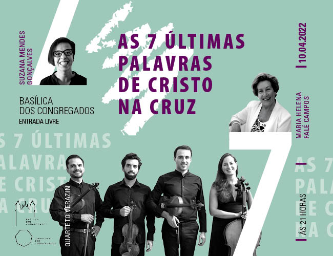 As Se7e Últimas Palavras de Cristo na Cruz. 10 de abril, Domingo de Ramos, às 21h, a Suzana Mendes Gonçalves, o Quarteto Verazin e a Maria Helena Falé, vão ajudar-nos a meditar as 7 Últimas Palavras de Cristo na Cruz.