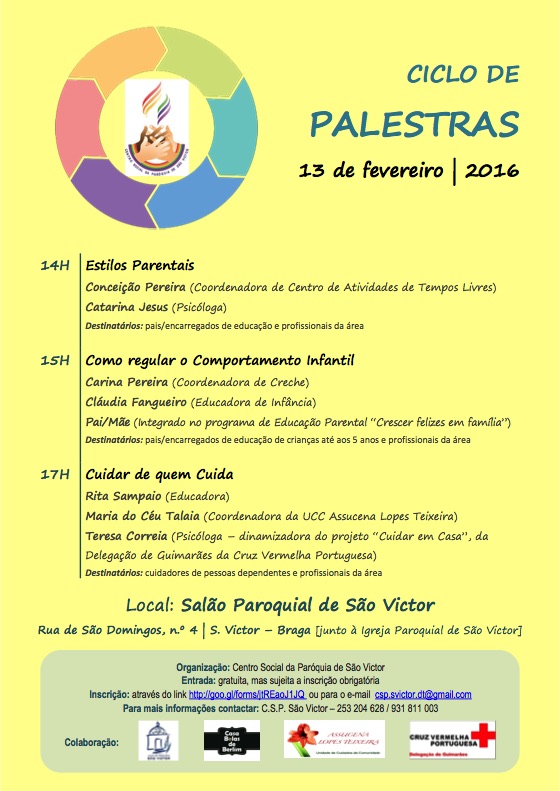 12 fevereiro 2016 Notícia A. Paróquia de S. Victor debate Educação Parental “Estilos Parentais”, “Como regular o Comportamento Infantil” e “Cuidar de quem Cuida” são os temas das três palestras.
