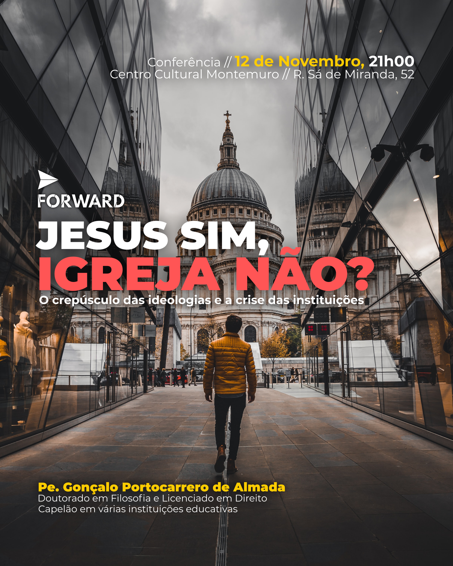 9 novembro 2021 Notícia A. Pe. Gonçalo Portocarrero de Almada profere conferência em Braga Conferência “Jesus sim, Igreja não? O crepúsculo das ideologias e a crise das instituições” acontece no âmbito da iniciativa "Forward Minho".