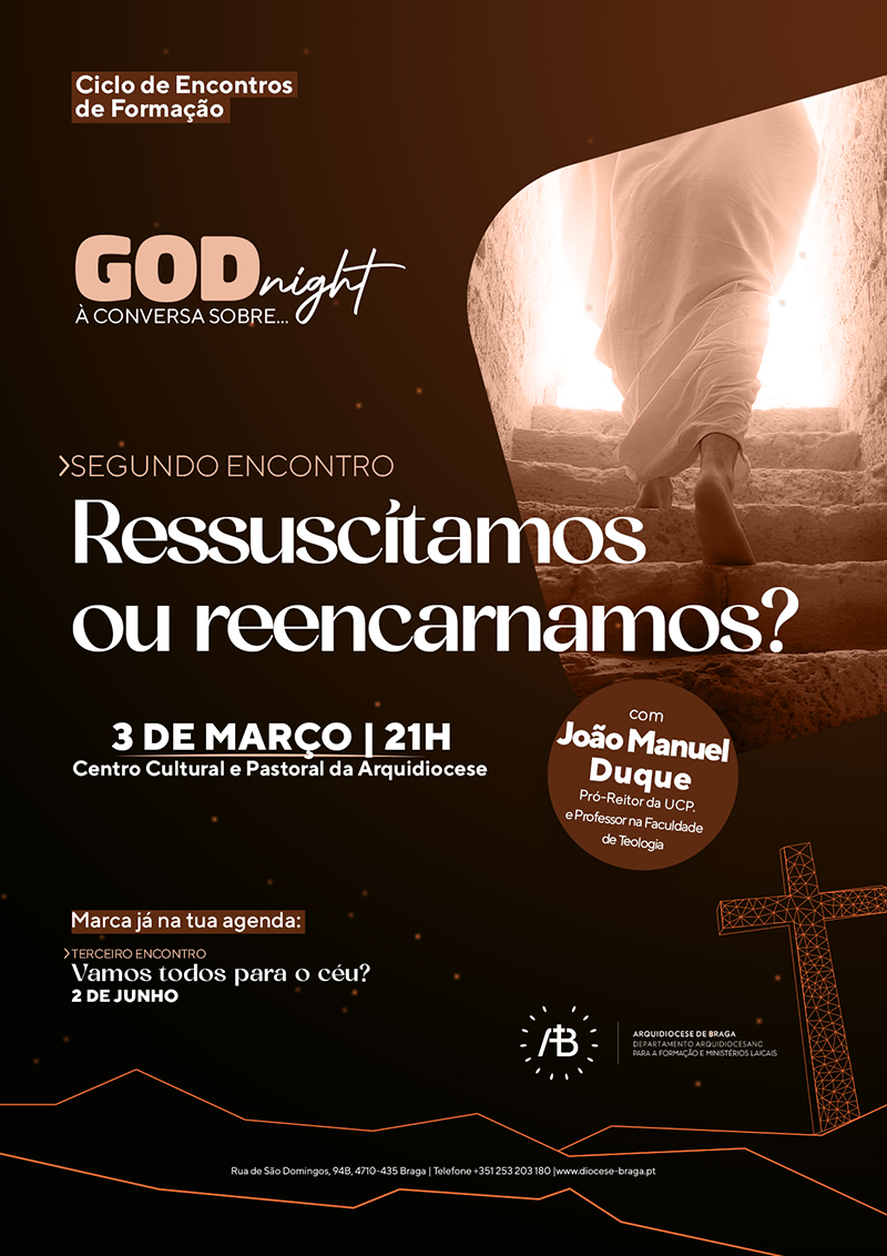 Departamento Arquidiocesano para a Formação e Ministérios Laicais 28 fevereiro 2023 Notícia A. GODnight: à conversa sobre... Ressuscitamos ou reencarnamos? O encontro será no dia 3 de março, no Centro Pastoral da Arquidiocese de Braga, às 21h.