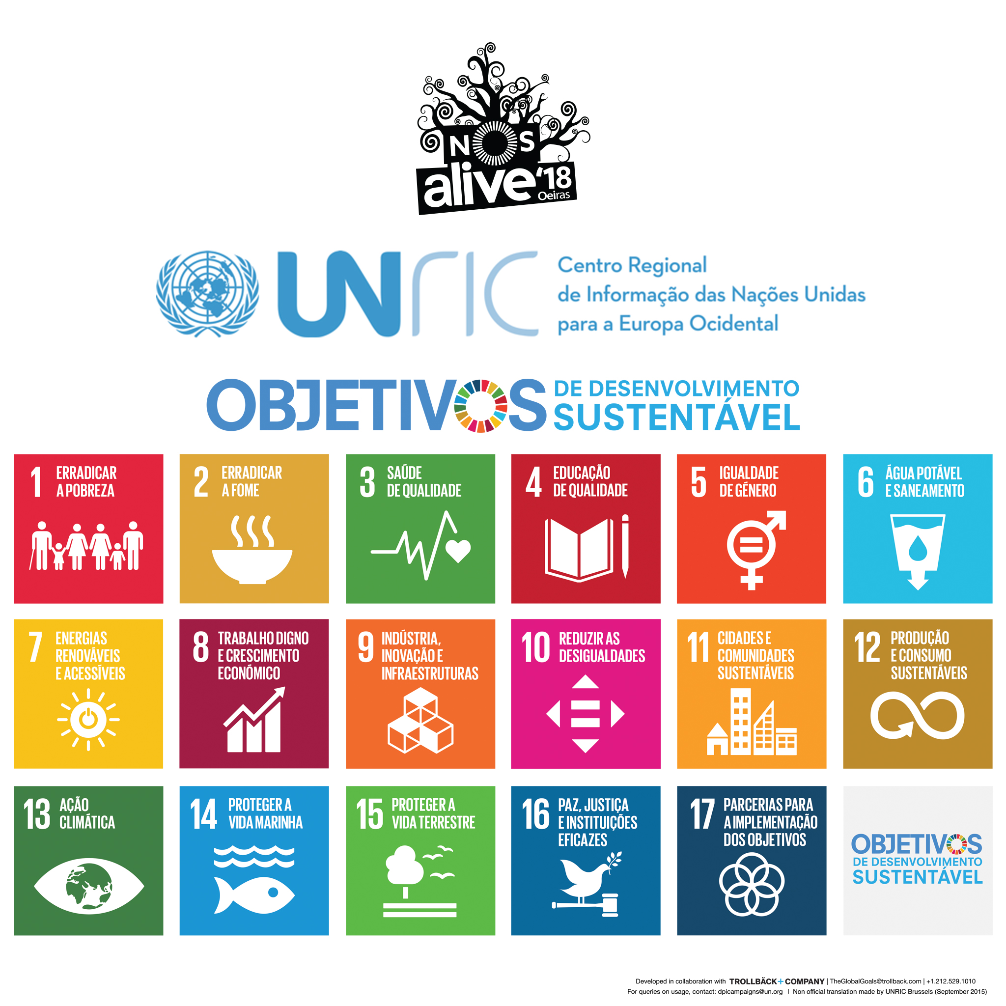 DR 23 março 2018 Notícia A. NOS Alive alia-se à ONU para "despertar as consciências" Organização do festival quer tornar o evento "cada vez mais sustentável" e ajudar a ONU a divulgar a Agenda 2030, onde estão inseridos os Objectivos de Desenvolvimento Sustentável.
