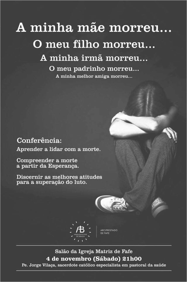 2 novembro 2017 Notícia A. Fafe promove conferência sobre o luto Reflexão orientada pelo Pe. Jorge Vilaça irá tentar ajudar a “discernir as melhores atitudes para a superação do luto”.