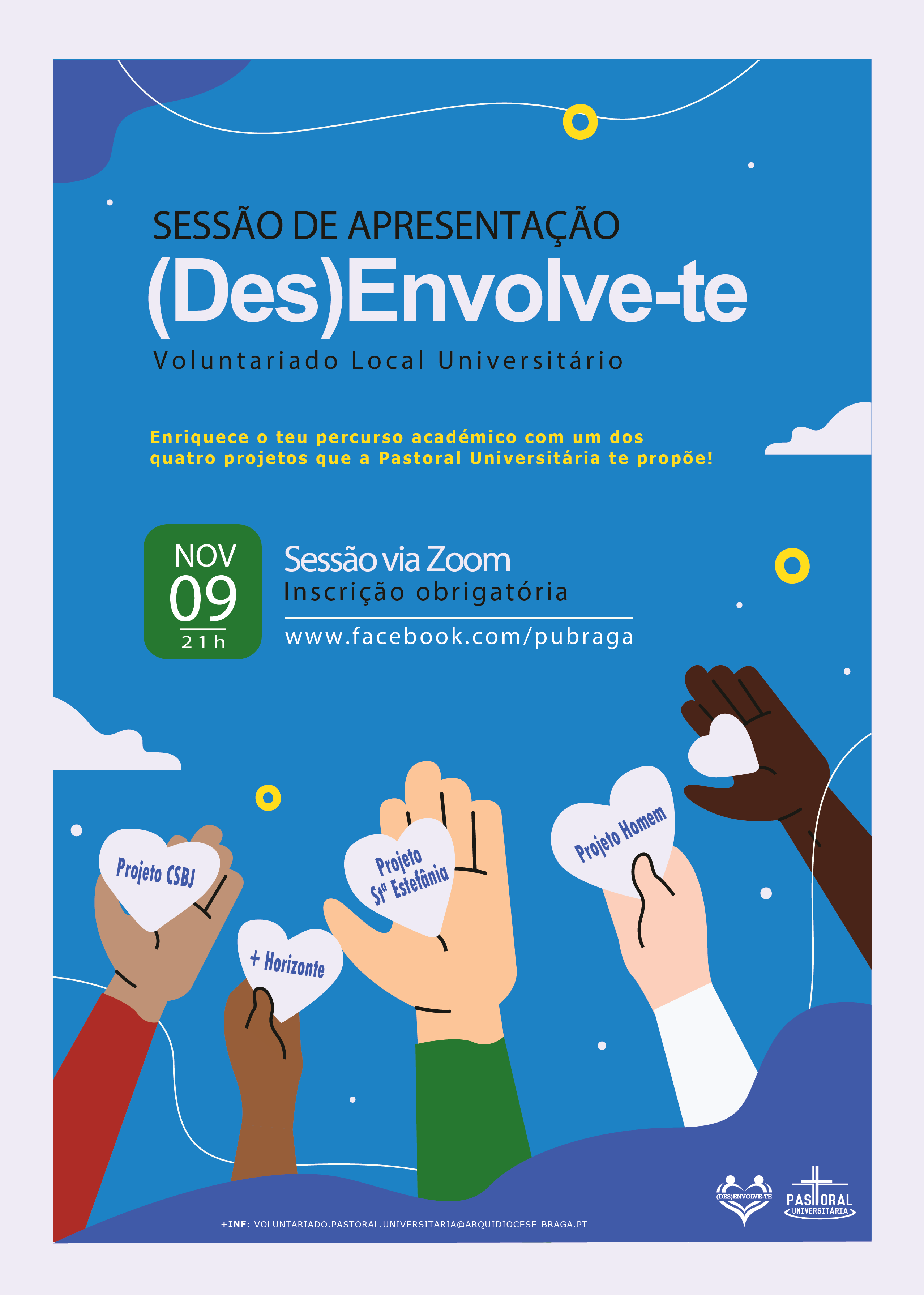 PUB 6 novembro 2020 Notícia A. O (Des)Envolve-te está de volta! Este ano, os jovens universitários podem ser voluntários em quatro projectos. Sessão de apresentação é no dia 9 de Novembro.