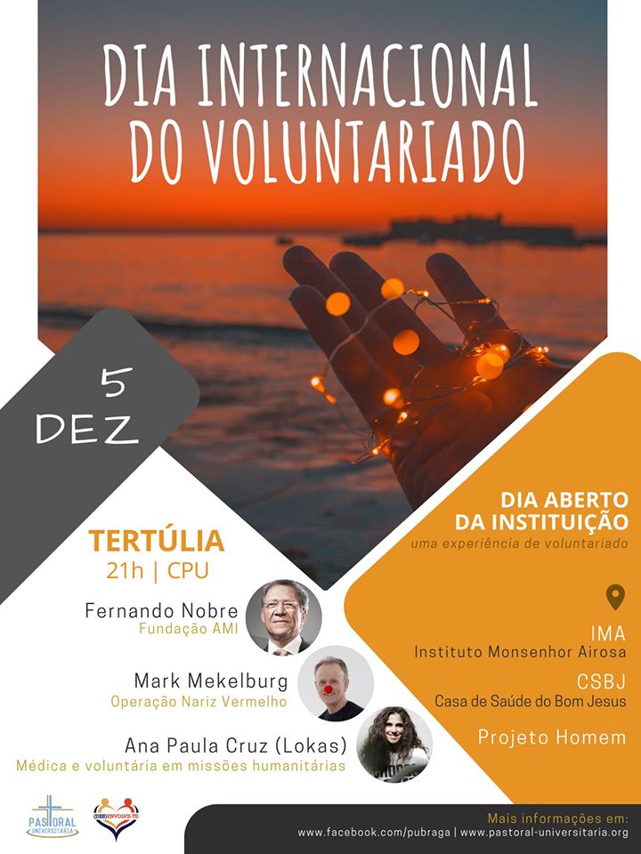 4 dezembro 2019 Notícia A. Pastoral Universitária celebra Dia do Voluntariado Estudantes terão oportunidade de fazer voluntariado durante o dia e participar em tertúlia à noite.