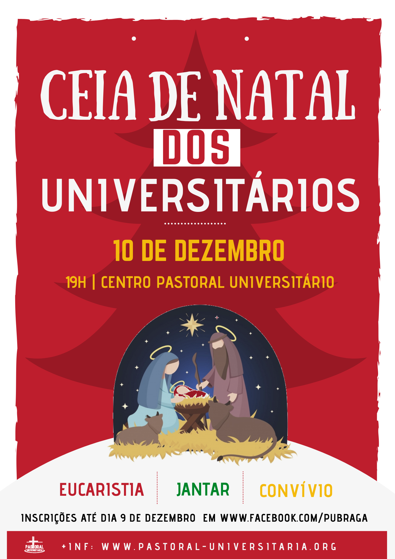 DR 6 dezembro 2019 Notícia A. Ceia dos Universitários está aí à porta! As festividades começam pelas 19h00 com Eucaristia, seguindo-se o jantar e momentos de convívio.