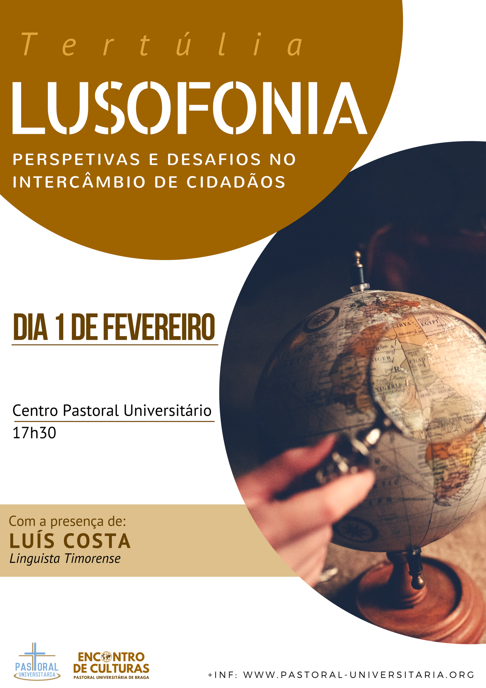 PUB 29 janeiro 2018 Notícia A. Pastoral Universitária: Perspectivas e Desafios na Lusofonia Tertúlia acontece no dia 1 de Fevereiro e conta com a presença de Luís Costa, autor do dicionário tétum-português.