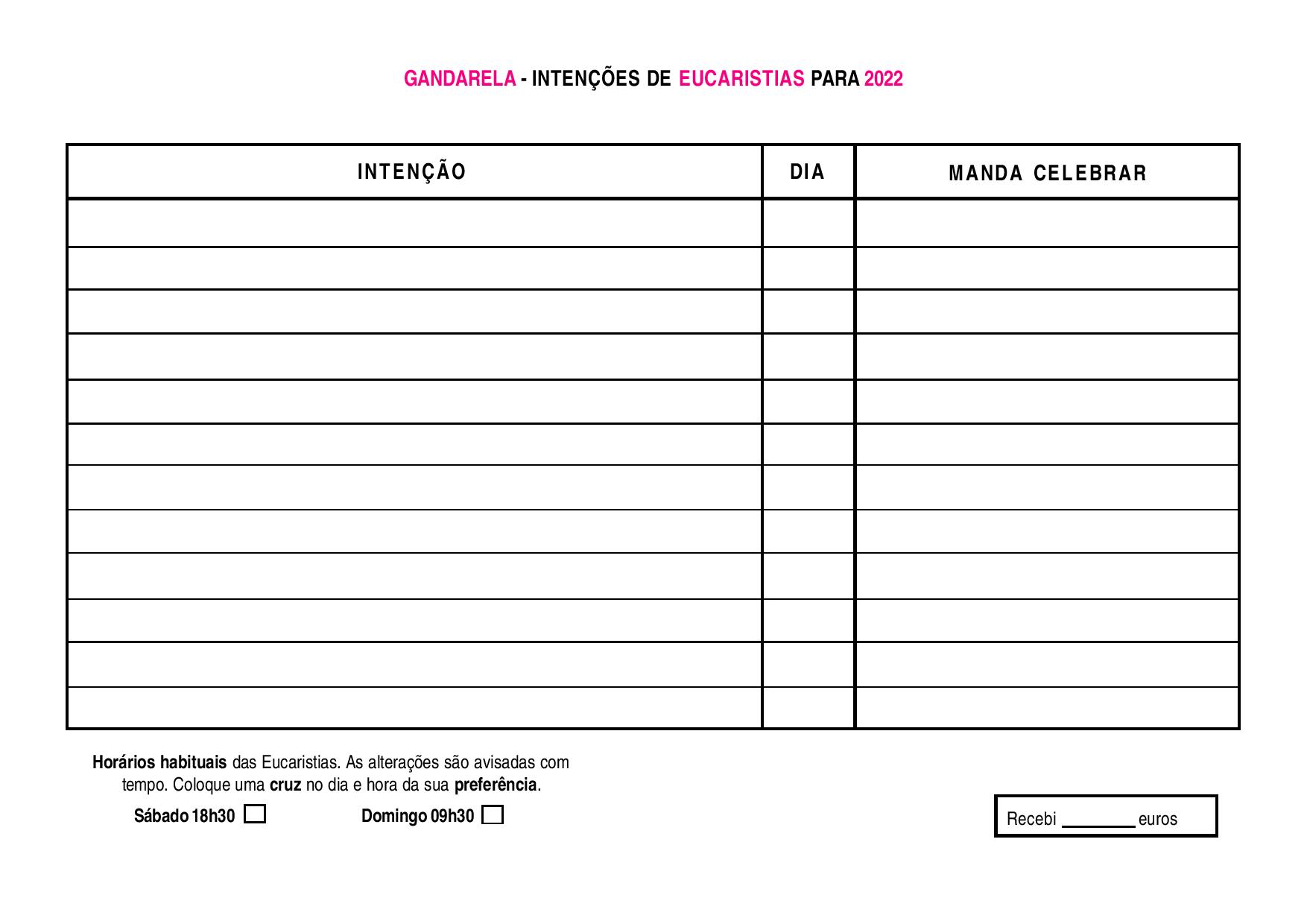 Folhas para marcar as intenções das EUCARISTIAS 2022.