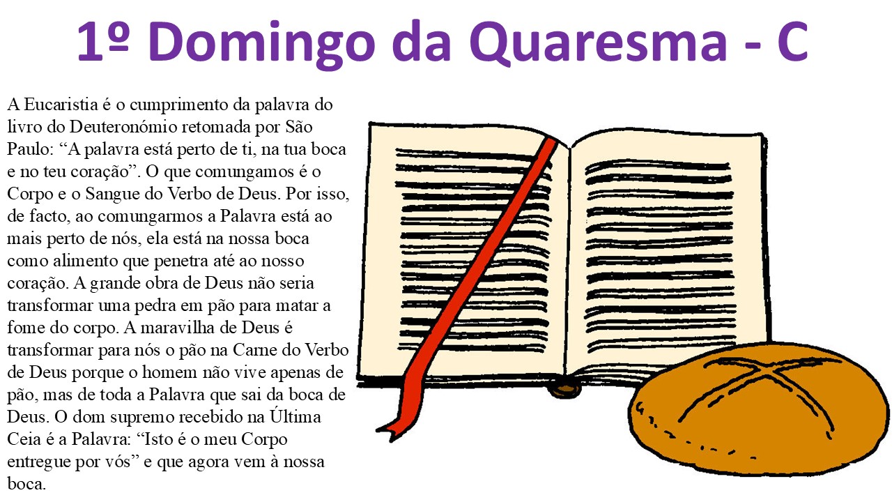A Eucaristia é o cumprimento da palavra do livro do Deuteronómio retomada por São Paulo: “a palavra está perto de ti, na tua boca e no teu coração”. O que comungamos é o Corpo e o Sangue do Verbo de Deus. Por isso, de facto, ao comungarmos, a Palavra está ao mais perto de nós, ela está na nossa boca como alimento que penetra até ao nosso coração. A grande obra de Deus não seria transformar uma pedra em pão para matar a fome do corpo. A maravilha de Deus é transformar para nós o pão na Carne do Verbo de Deus, porque o homem não vive apenas de pão, mas de toda a Palavra que sai da boca de Deus. O dom supremo recebido na Última Ceia é a Palavra: “isto é o meu Corpo entregue por vós” e que agora vem à nossa boca.