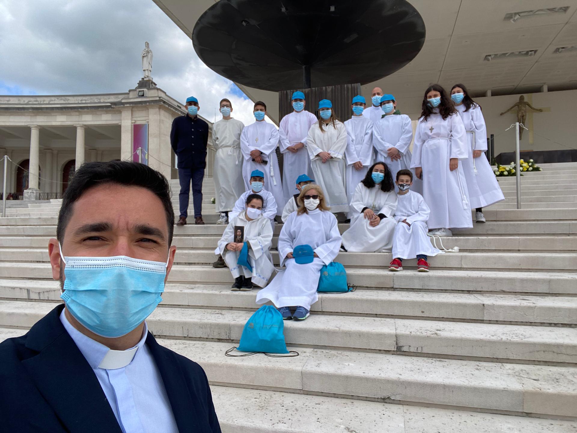 Já em Fátima, a comitiva de Braga fez um momento de oração na Capelinha das Aparições, preparando-se, depois, para participar na Eucaristia, presidida pelo Cardeal do Luxemburgo e presidente do Coetus Internationalis Ministrantium (associação internacional de acólitos), D. Jean-Claude Höllerich, no recinto do Santuário. Durante a Eucaristia, D. José Cordeiro, presidente da Comissão Episcopal de Liturgia e Espiritualidade, leu a mensagem do Papa Francisco para este encontro. Durante a homilia, o presidente da celebração apelou ao caminho de santidade que o acólito é chamado a percorrer na amizade com Jesus, dando testemunho de como foi importante este ministério no seu caminho de discernimento vocacional. A Eucaristia foi concelebrada por diversos bispos e sacerdotes, inclusive pelo Cardeal D. António Marto, que no final da celebração dirigiu uma palavra de estímulo aos cerca de 400 participantes e a tantos outros peregrinos ali presentes.