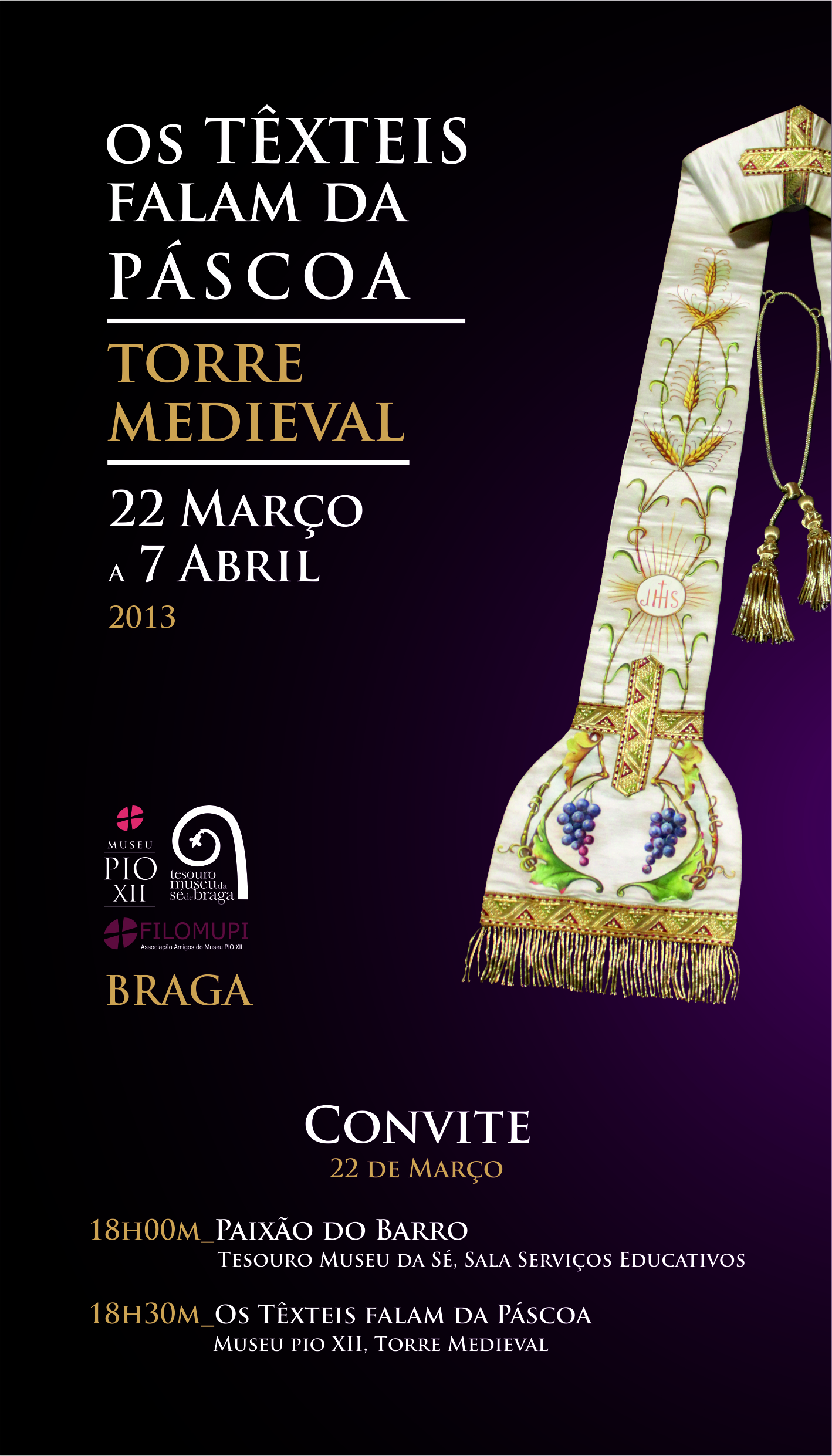 A FILOMUPI- Associação dos Amigos do Museu Pio XII, vai promover uma exposição subordinada ao tema “ O Têxtil na Páscoa”, entre os dias 22 de Março e 7 de Abril, na Torre Medieval do Museu Pio XII e poderá ser visitada entre as 9h30 e as 12h30 e as 14h30