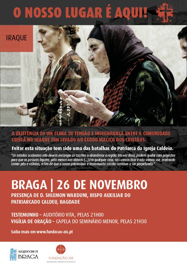 A Fundação Ajuda a Igreja que Sofre e a Arquidiocese de Braga, em solidariedade com a Igreja Cristã no Iraque, promove um encontro no qual D. Shlemon Warduni, Bispo Auxiliar do Patriarcado Caldeu, dará o seu testemunho sobre a comunidade cristã no Iraque, no próximo dia 26 de novembro, pelas 21:00h, no Auditório Vita, seguida de uma vigília de oração no Seminário Menor.