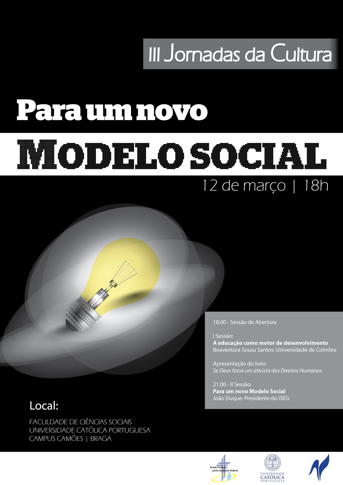 Programa preliminar: 18h00 - Sessão de Abertura. I Sessão: A educação como motor do desenvolvimento - Boaventura Sousa Santos (Universidade de Coimbra). Apresentação do Livro: “Se Deus fosse um ativista dos Direitos Humanos” por: Paulo Mourão (Universidade do Minho)