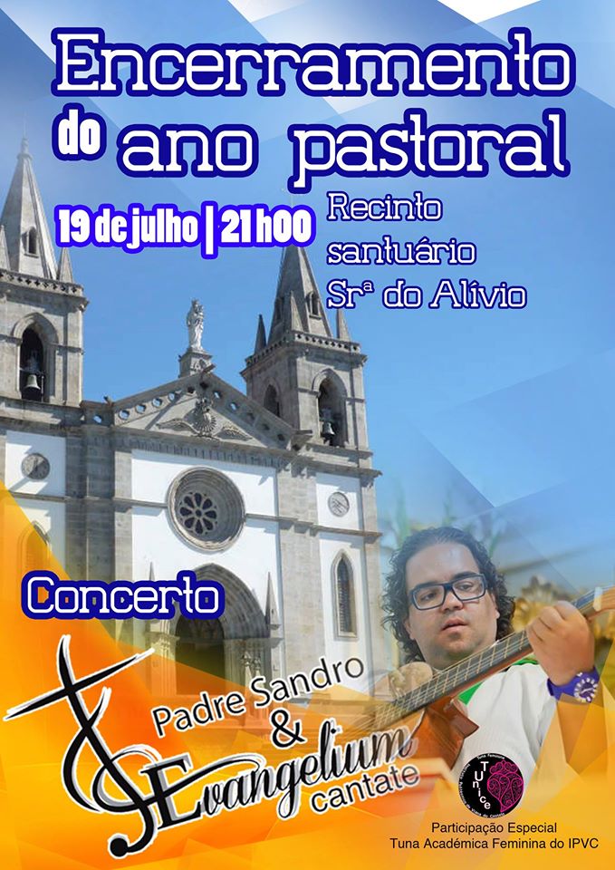 No âmbito do encerramento do ano pastoral no arciprestado de Vila Verde, realiza-se um concerto do Pe. Sandro Vasconcelos & Evangelium Cantate, contando ainda com a participação da Tuna Académica Feminina do Insituto Politénico de Viana do Castelo, no santuário de Nossa Senhora do Alívio, no próximo dia 19 de julho às 21h.