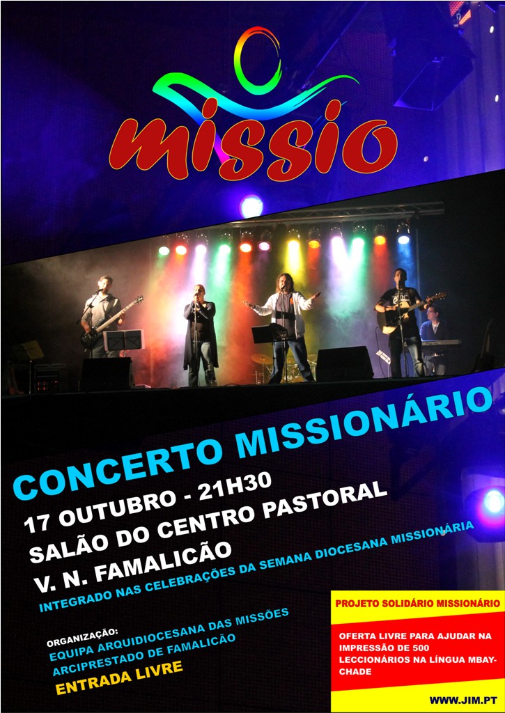 “Missio” é o nome da banda protagonista da noite. Com música de inspiração Cristã, ligada ao Centro Vocacional Juvenil dos Missionários Combonianos, a banda pop/rock com um CD já editado e vários concertos protagonizados, desde Paredes de Coura até à Quarteira, utiliza a música para a evangelização juvenil.