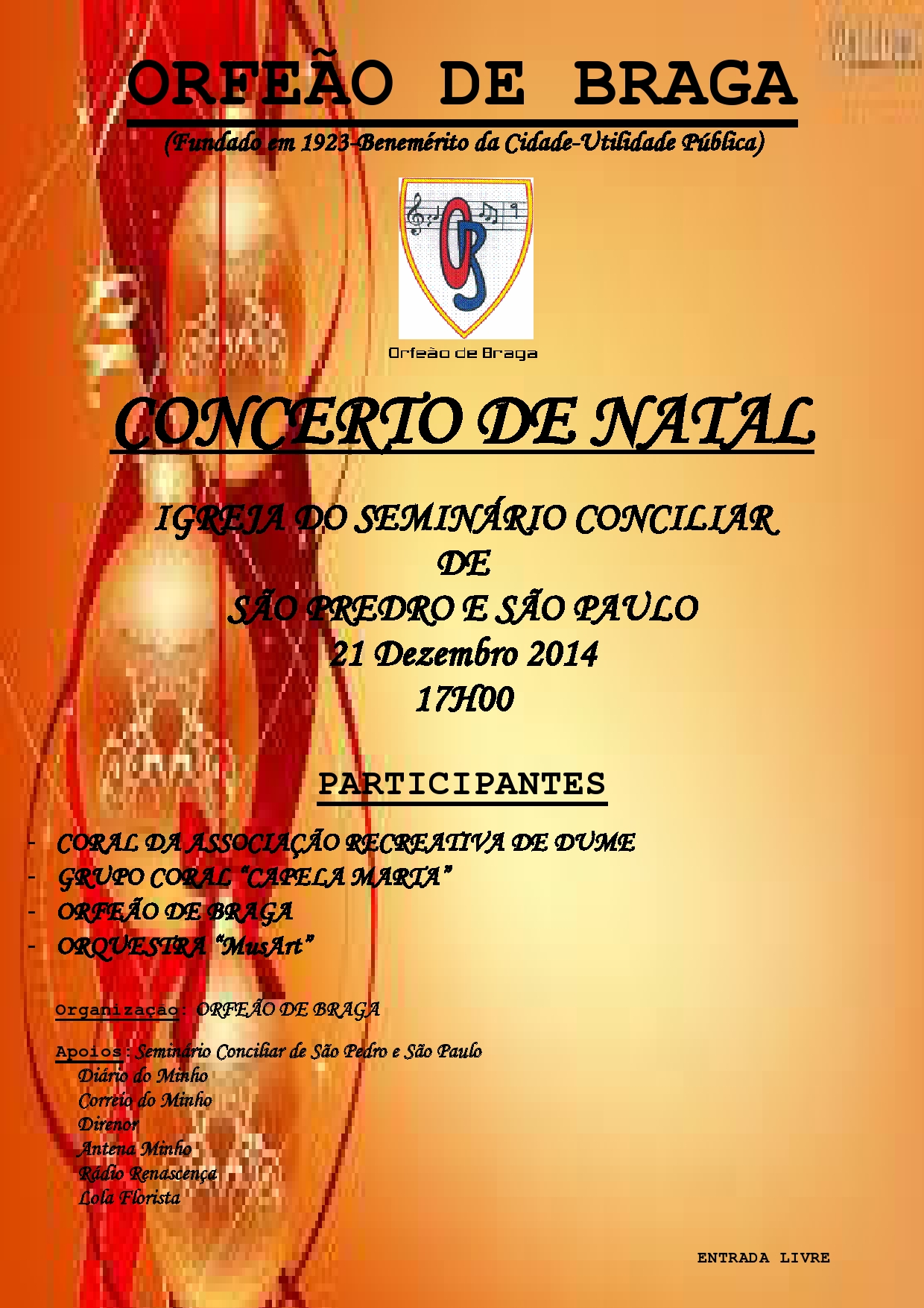 No dia 21 de Dezembro, pelas 17h00, na Igreja do Seminário Conciliar de São Pedro e São Paulo, terá lugar um concerto de Natal organizado pela direcção do Orfeão de Braga.