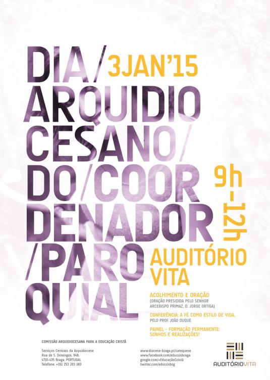 O Dia Arquidiocesano do Coordenador Paroquial, promovido pela Comissão Arquidiocesana para a Educação Cristã, realizar-se-á durante a manhã do dia 3 de Janeiro, no Auditório Vita.