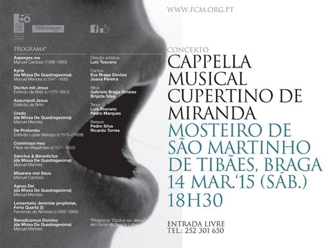 No próximo dia 14 de Março, Sábado, a Capella Musical Cupertino de Miranda, com direcção artística de Luís Toscano, protagoniza mais um concerto, desta vez no Mosteiro de Tibães.