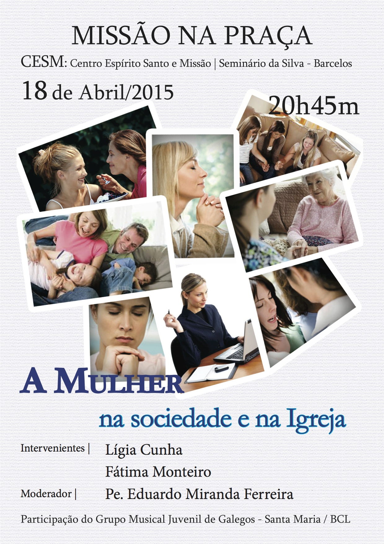 No próximo dia 18 de Abril, pelas 20h45, decorre no Centro Espírito Santo e Missão (CESM), Seminário da Silva, em Barcelos, uma tertúlia intitulada "A Mulher na Sociedade e na Igreja".