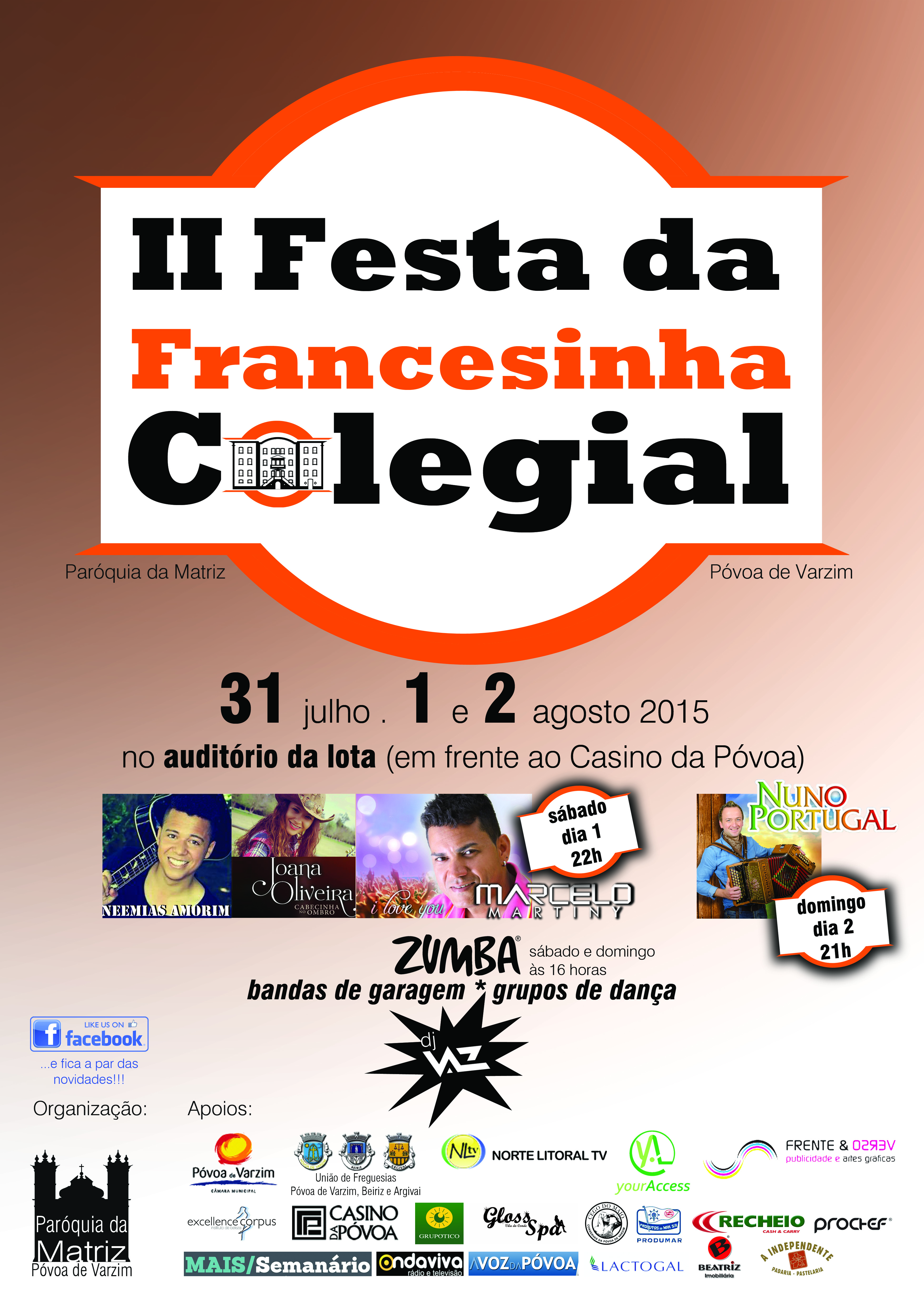 A Paróquia da Matriz da Póvoa de Varzim vai realizar a “II Festa da Francesinha Colegial” nos dias 31 de Julho, 1 e 2 de Agosto, junto ao porto de Pesca, na Avenida dos Descobrimentos, (Palco da Lota - frente ao Casino), com actuações ao vivo, juntando vários poveiros e veraneantes.