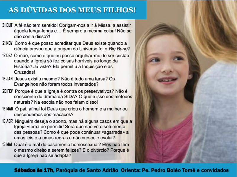 O primeiro encontro de formação para jovens e adultos, organizado pela paróquia de Santo Adrião, é já amanhã, dia 31 de Outubro, sob o lema “As Dúvidas dos meus filhos”. A sessão está marcada para as 17h, no salão paroquial de Santo Adrião, e conta com a orientação do Pe. Pedro Boleo e convidados.