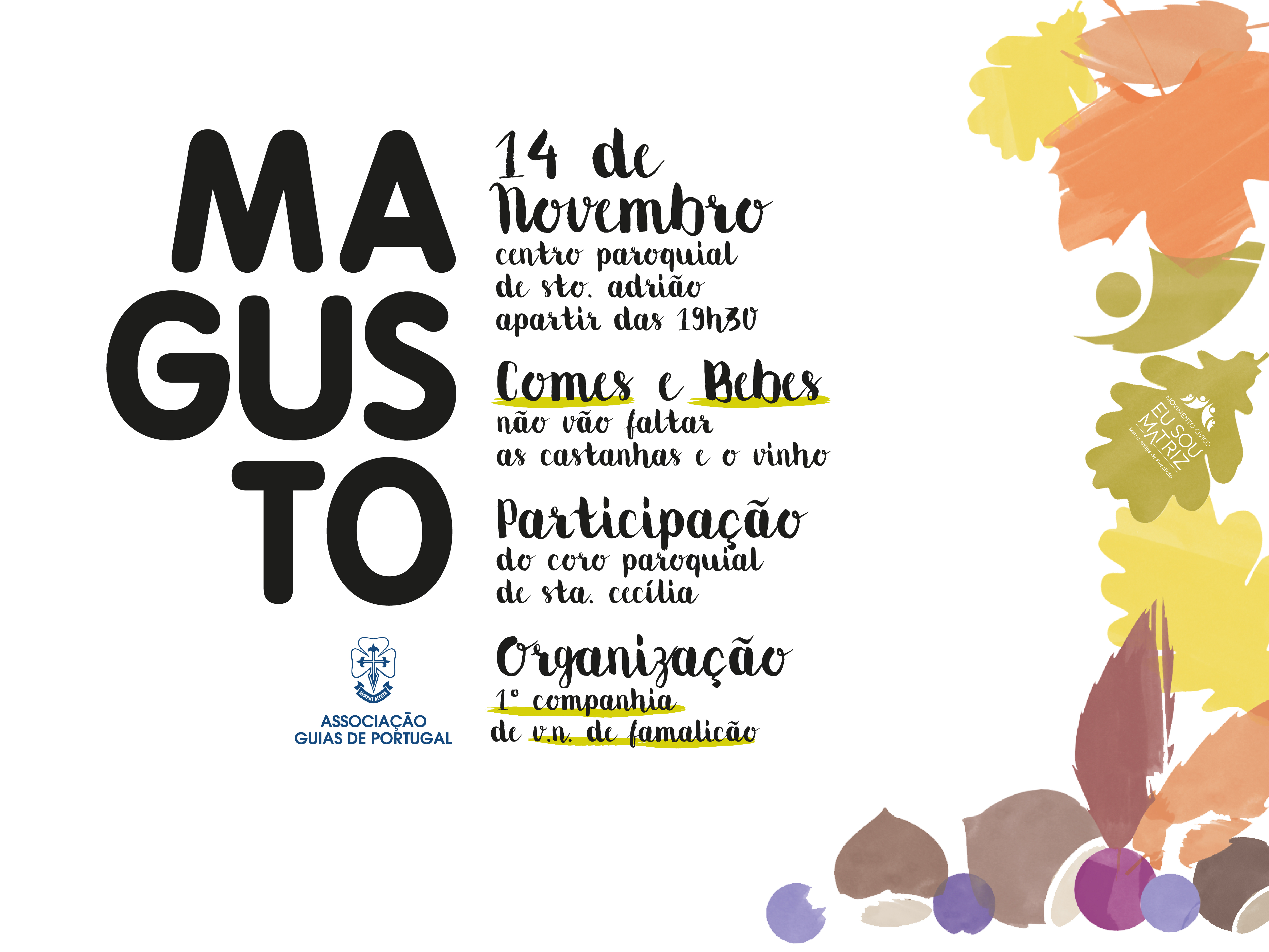 No próximo Sábado, dia 14 de Novembro, pelas 19h30, realiza-se o Magusto Paroquial de Santo Adrião, em Vila Nova de Famalicão, no Centro Pastoral da paróquia. As receitas revertem para as obras da Matriz Antiga.