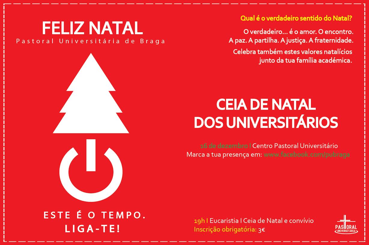 A Pastoral Universitária está a organizar uma Ceia de Natal, a decorrer dia 16 de Dezembro, pelas 19h. As inscrições poderão ser efectuadas até à próxima Segunda-feira, 14 de Dezembro.