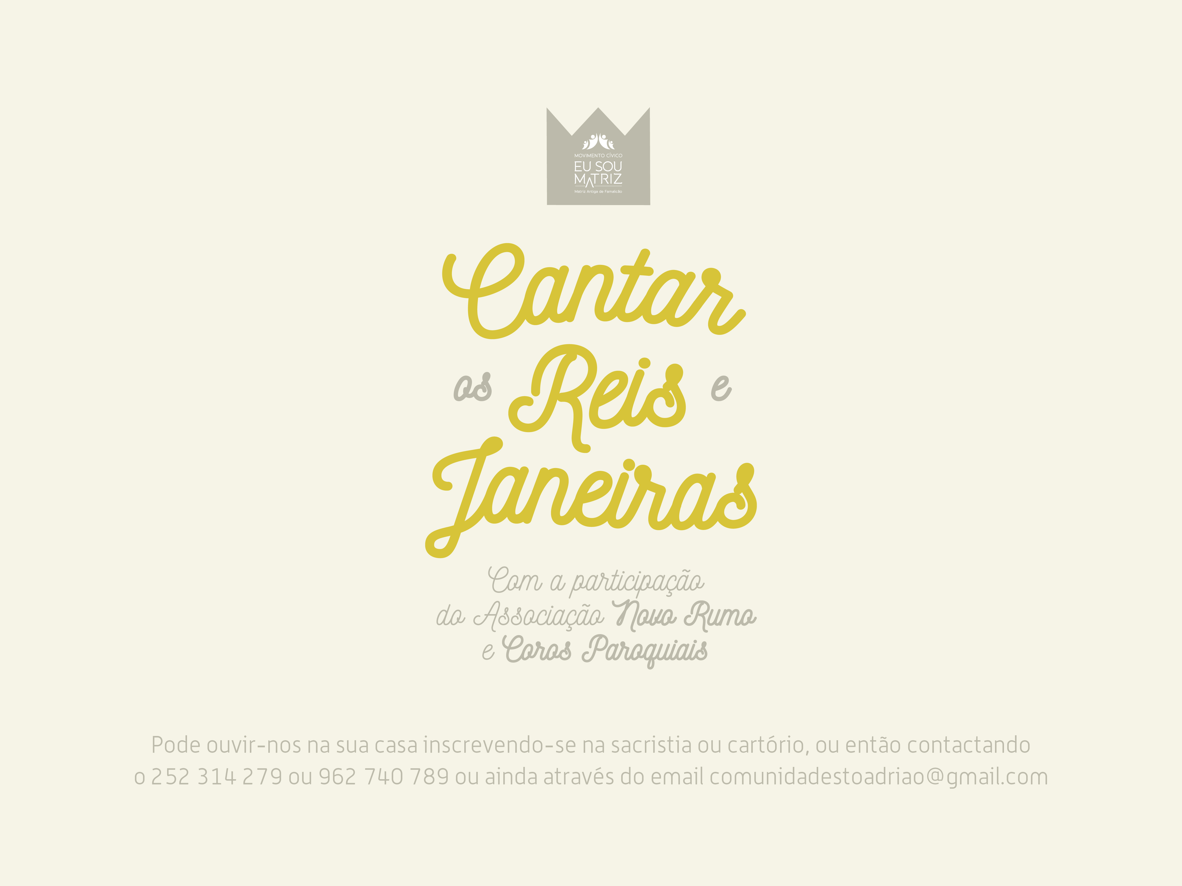 Quem desejar receber o cantar das Janeiras em sua casa pode inscrever-se através do email [email protected], na sacristia ou cartório paroquial.