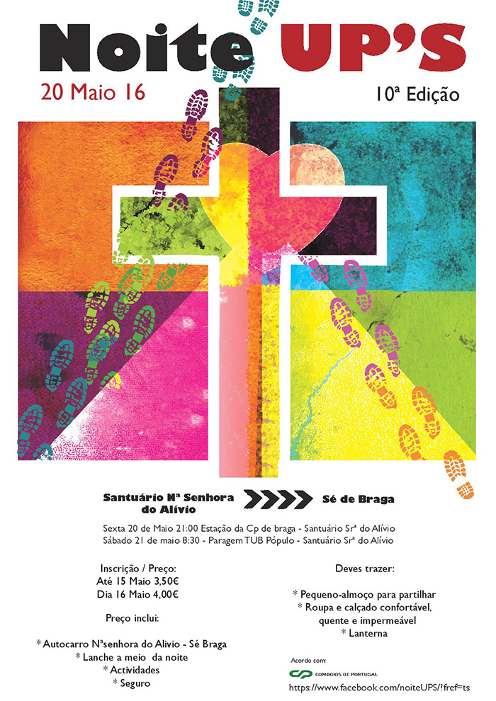 A "Noite UP'S - Uma Directa com Deus" está de volta. Este ano, subordinada ao tema "Dá o Passo", acontece na passagem de 20 para 21 de Maio, partindo do Santuário da Senhora do Alívio, Vila Verde, rumo à Sé Catedral.