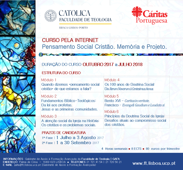 A Faculdade de Teologia da Universidade Católica Portuguesa, em parceria com a Cáritas Portuguesa, propõe um curso online sobre Pensamento Social Cristão. A formação arranca em Outubro e a segunda fase de candidaturas decorre até dia 30 de Setembro.