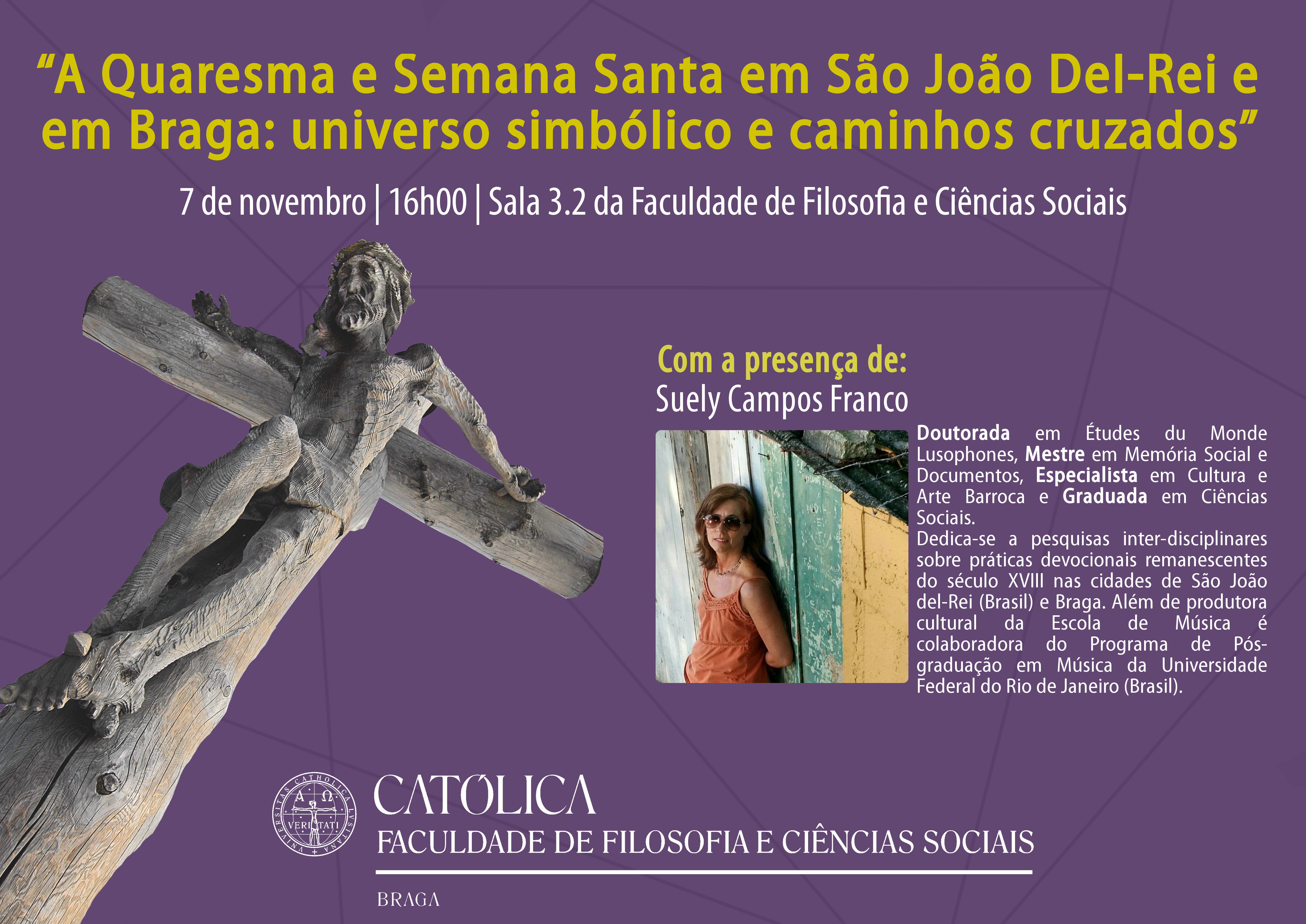 A Faculdade de Filosofia e Ciências Sociais da Universidade Católica Portuguesa em Braga recebe amanhã, dia 7 de Novembro, às 16h, uma aula aberta intitulada “A Quaresma e Semana Santa em São João del-Rei e em Braga: universo simbólico e caminhos cruzados”, a decorrer na sala 3.2.