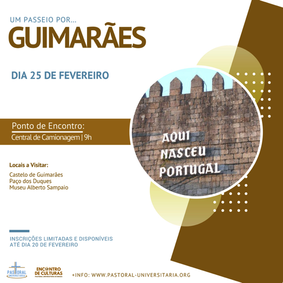 A Pastoral Universitária de Braga está a organizar um passeio pela cidade de Guimarães, no âmbito do projecto "Encontro de Culturas". A iniciativa realiza-se no próximo Domingo, dia 25 de Fevereiro, com ponto de encontro às 9h na Central de Camionagem de Braga.
