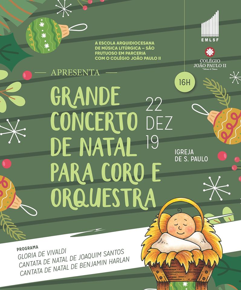 Decorre no Domingo, dia 22 de Dezembro, um Grande Concerto de Natal organizado pela Escola de Música Litúrgica de São Frutuoso (EMLSF) e pelo Colégio João Paulo II. O evento tem lugar na Igreja de São Paulo pelas 16 horas.