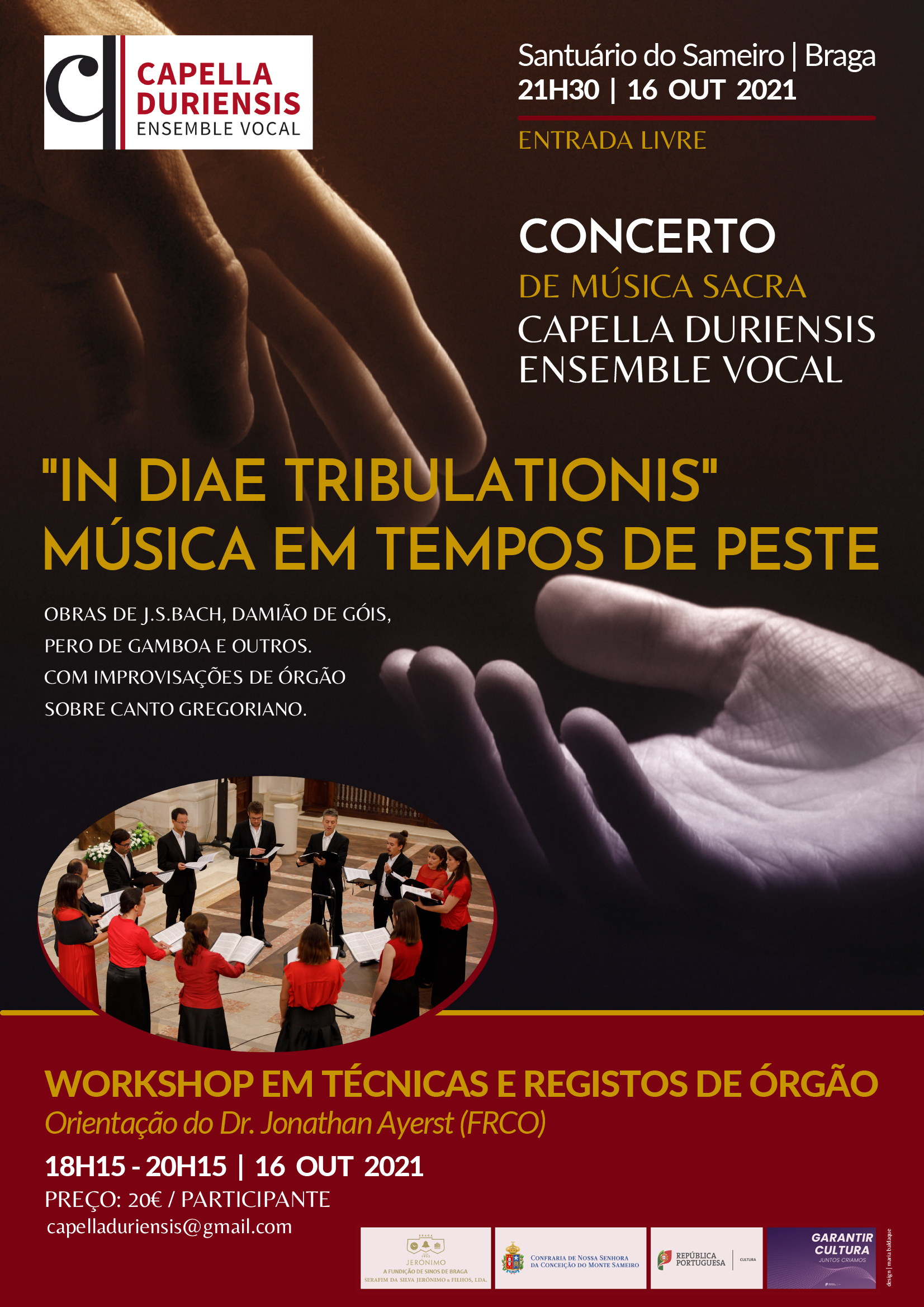 O concerto tem o tema “In Diae Tribulations”, sobre música em tempos de peste, e vai contar com obras de Johann Sebastian Bach, Damião de Góis, Pero de Gamboa e outros, e com improvisações de órgão sobre canto gregoriano.