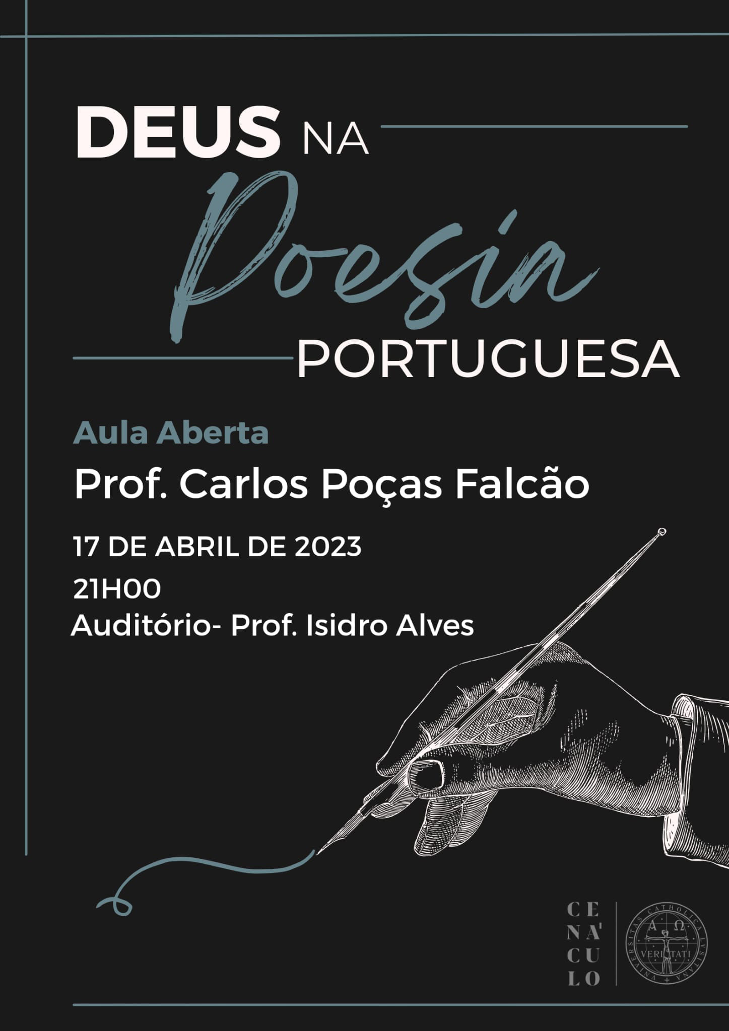 No próximo dia 17 de Abril, pelas 21h, decorrerá uma aula aberta no Auditório Prof. Isidro Alves, da Faculdade de Teologia de Braga, sob a orientação do conhecido poeta Carlos Poças Falcão.