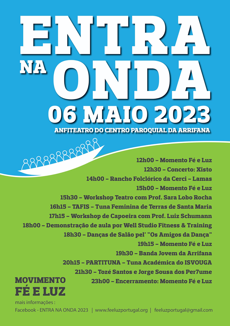 No próximo dia 6 de maio, o Movimento Fé e Luz vai organizar, como já tem vindo a ser habitual, o evento Entra na Onda: um dia cheio de atividades, de animação e de partilha, aberto a todas as pessoas que queiram “entrar na onda”. Este ano, o evento decorrerá no Anfiteatro do Centro Social e Paroquial da Arrifana, entre as 12h e as 23h do dia 6 de maio.