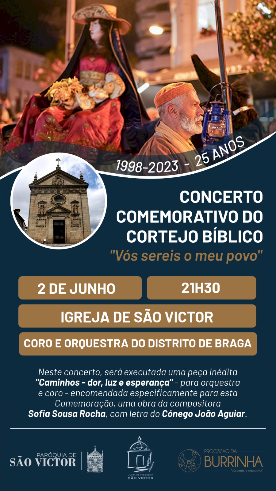 A Comissão Organizadora do Cortejo Bíblico «Vós sereis o meu povo», conhecido como Procissão da Burrinha, organiza um concerto evocativo dos 25 anos deste Cortejo Bíblico. O espetáculo decorre no próximo dia 2 de junho, às 21h30, na Igreja de São Victor, com o coro e orquestra do distrito de Braga.