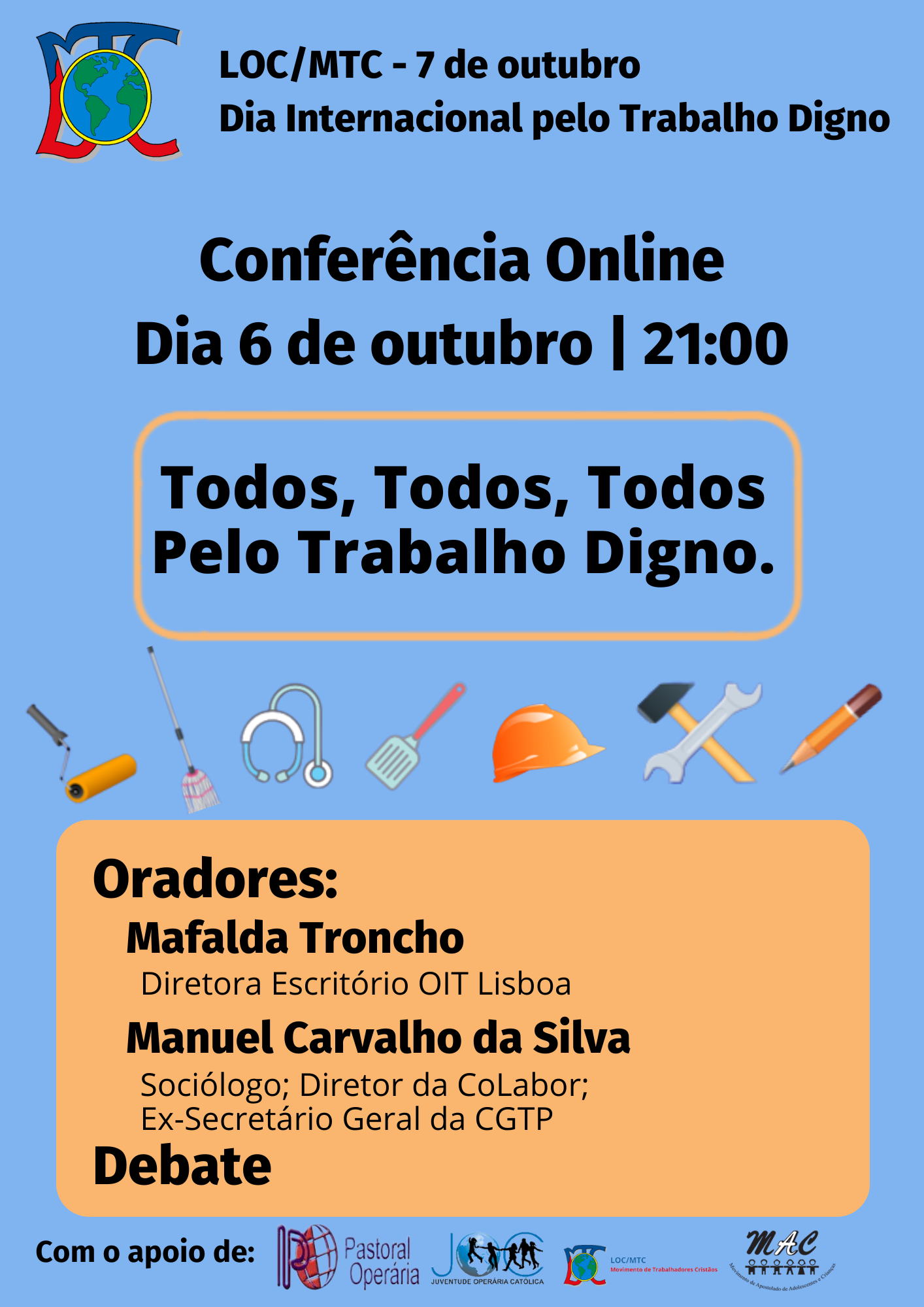 De forma a assinalar a data, a LOC/MTC promove uma conferência na noite de sexta-feira, dia 6 de outubro. A iniciativa, com o título “Todos, todos, todos pelo trabalho digno” tem início às 21h. A sessão tem como oradores Mafalda Trecho, Diretora do Escritório OIT Lisboa e Manuel Carvalho da Silva, Sociólogo, Diretor da CoLabor e Es-secretário Geral da CGTP.