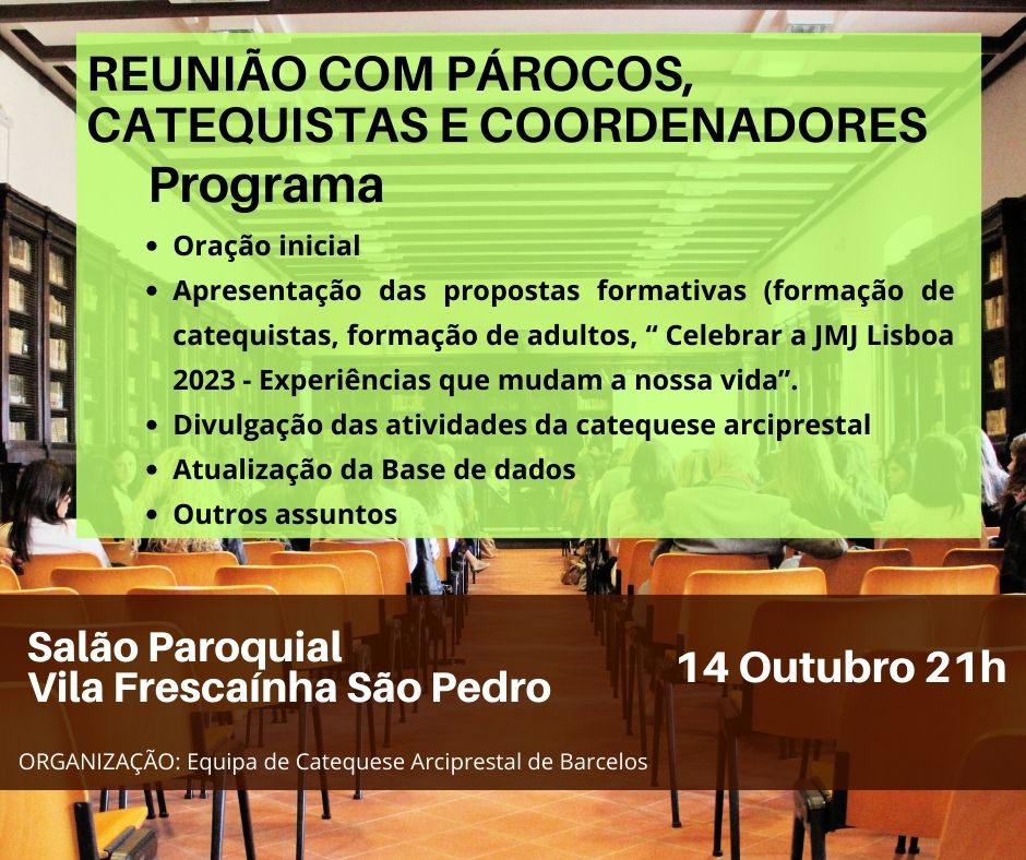 A Equipa da Catequese Arciprestal (ECA) de Barcelos convida todos os catequistas, coordenadores da catequese e sacerdotes do arciprestado de Barcelos a estarem presentes na reunião no dia 14 de outubro, às 21h, no salão paroquial de Vila Frescaínha São Pedro.