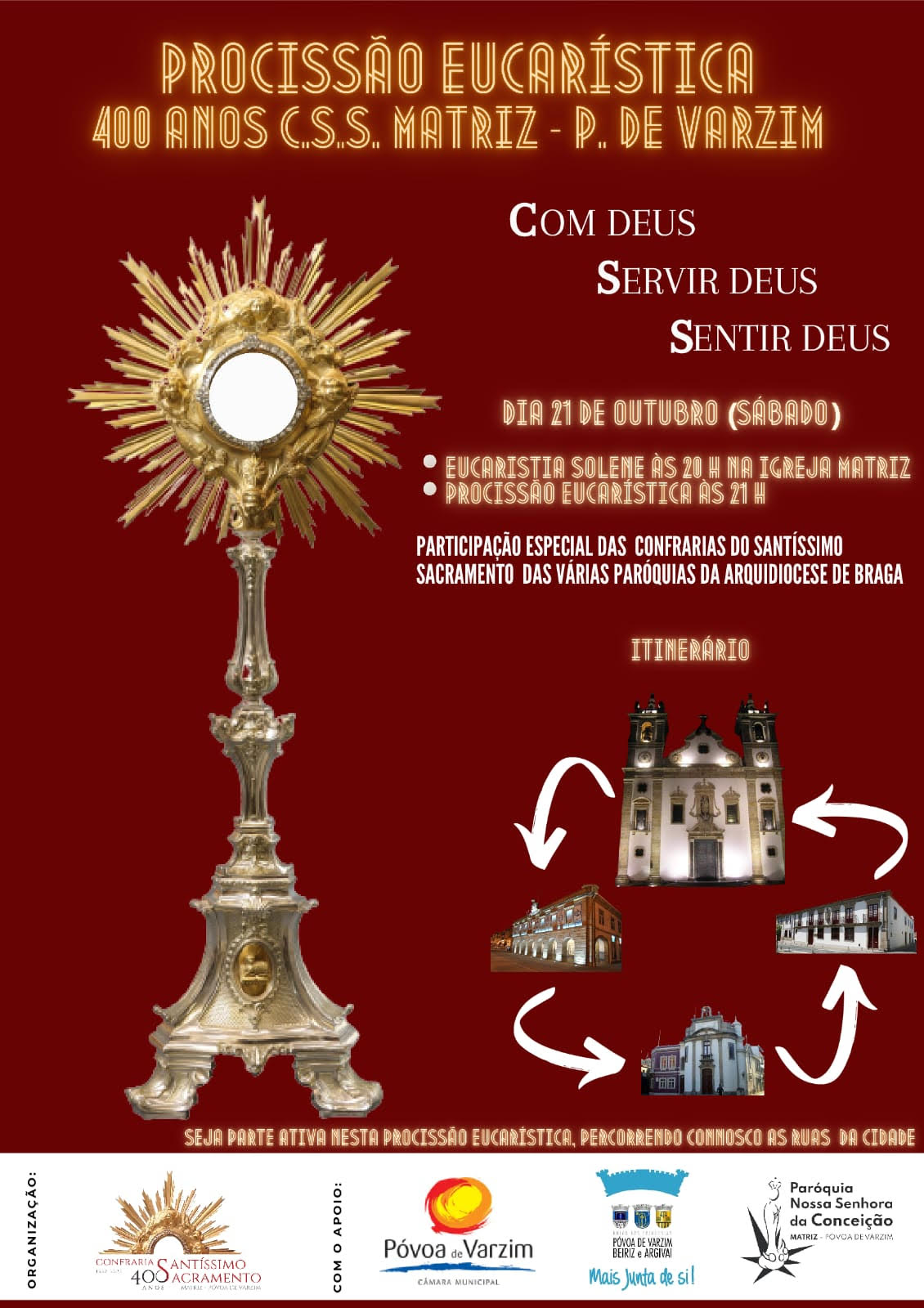 A Confraria do Santíssimo Sacramento da Nossa Senhora da Conceição (Matriz) - Póvoa de Varzim celebra este ano 400 anos de existência e marcará a data com Procissão Eucarística Comemorativa dos 400 anos da CSS, que acontece no dia 21 de outubro, às 21h.